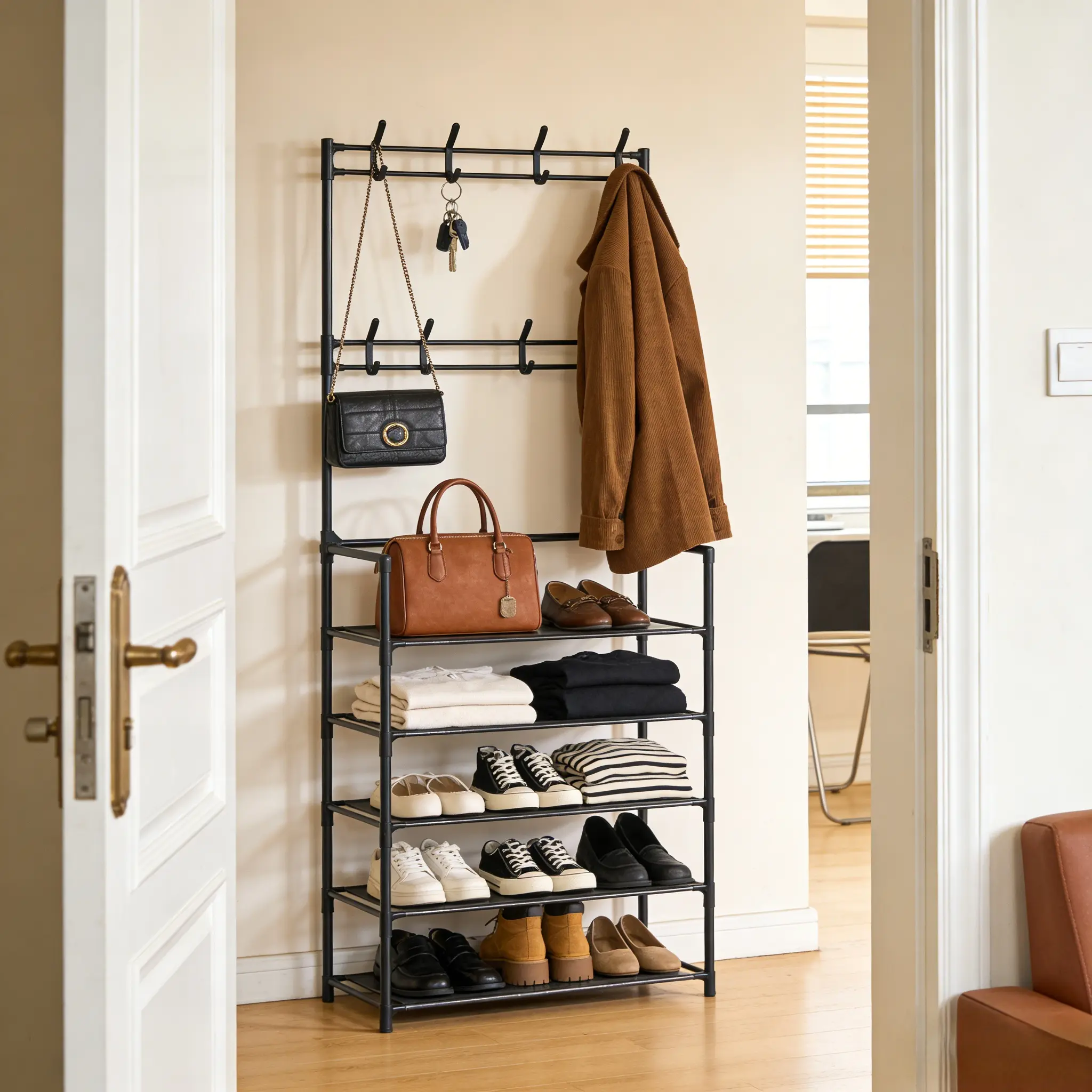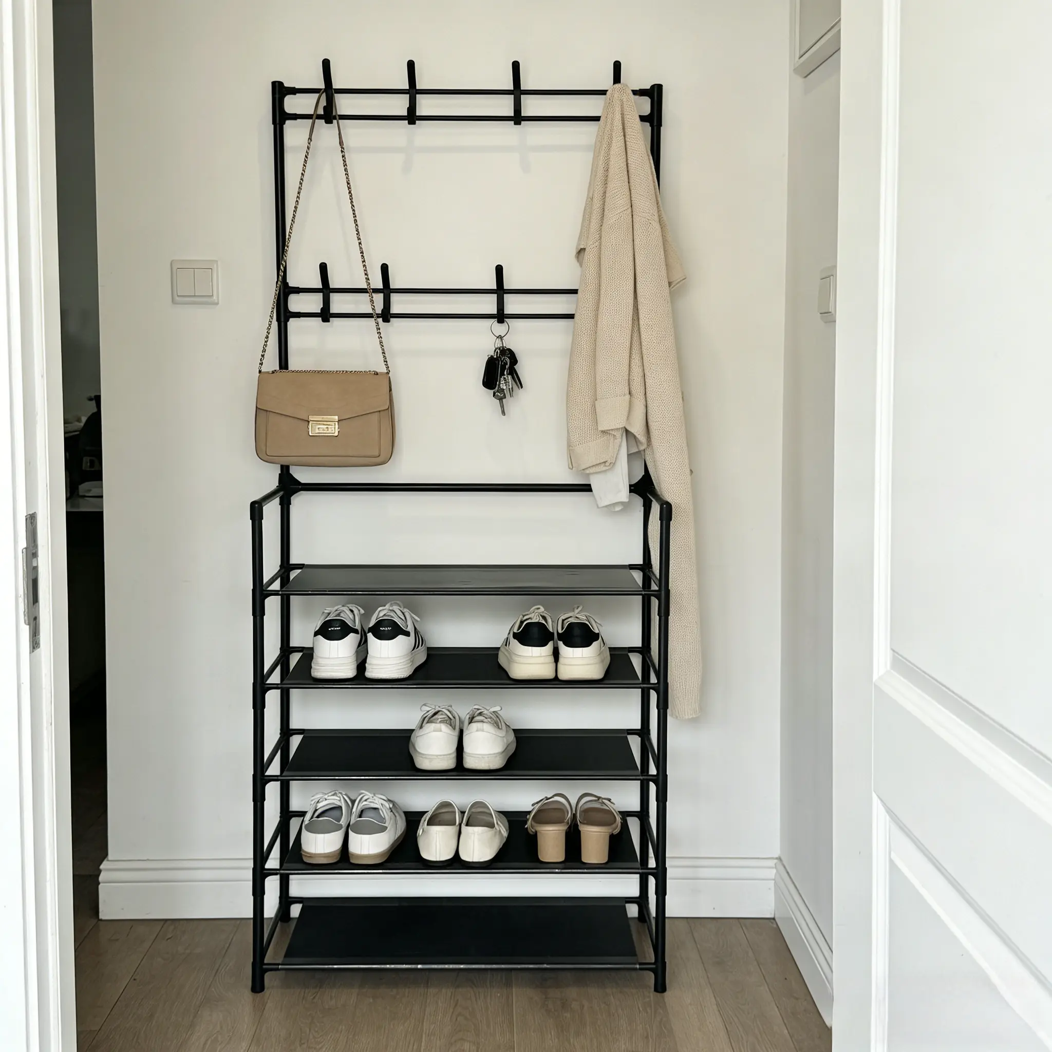 Exclusive hanging area on the upper level, with reasonable spacing between hanging poles, allowing for easy access to coats, bags, hats, and scarves without being squeezed; The lower layer multi-layer storage rack is precisely layered, with high heels, flat shoes, sports shoes, children's shoes classified and stored, and small items such as bags and storage boxes can also be placed. Clothes, hats, and shoes are separated, and the doorstep is instantly refreshed.