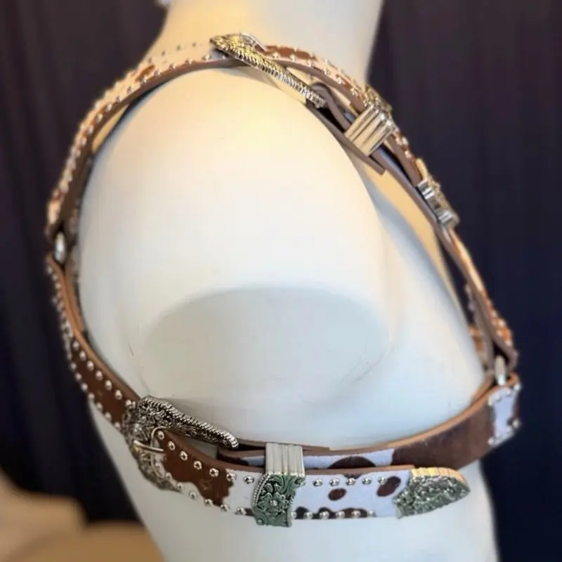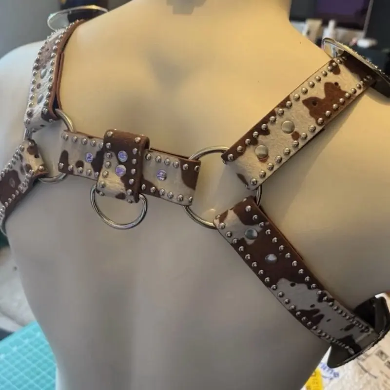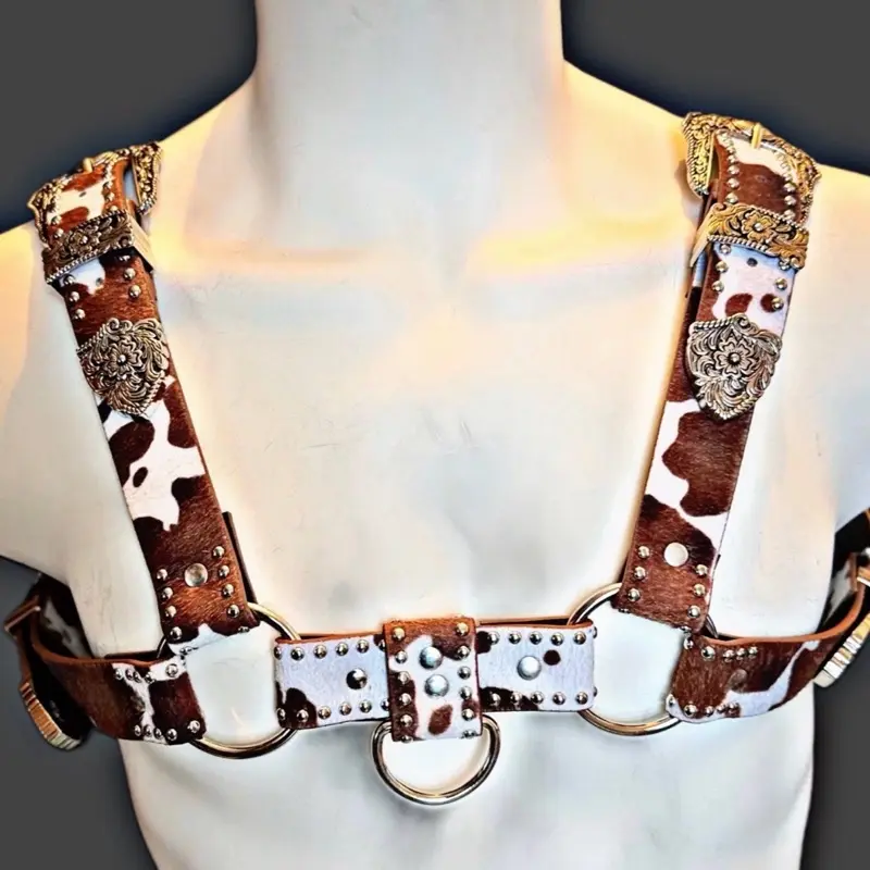 A massive Cowboy Style Bull dog Chest harness of a few belts in a Cow printed pattern. Made of the best quality belts and metal fittings.
