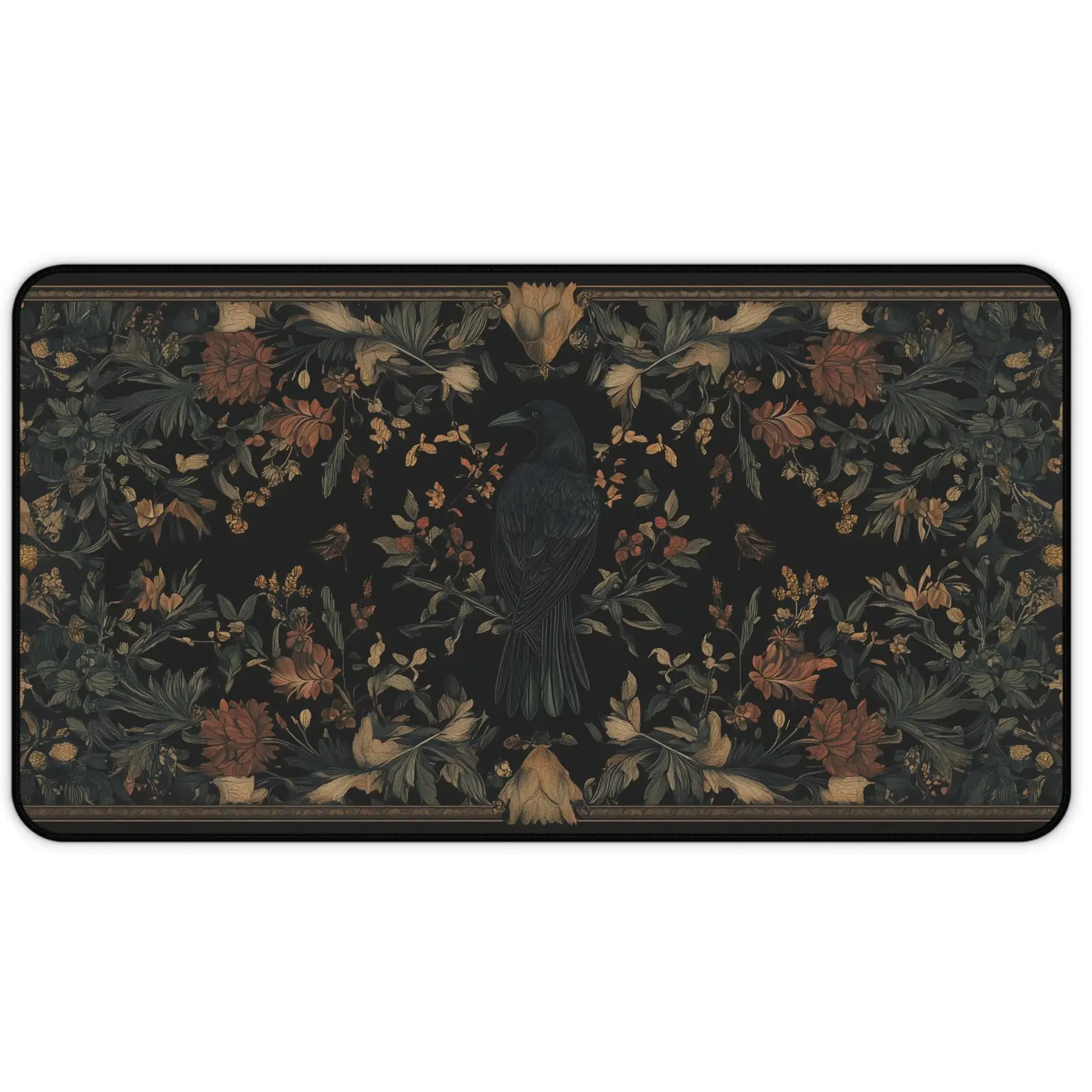 Gothic Raven Desk Mat, Vintage Dark Floral Crow Mouse Pad, Witchy Academia Gaming Setup, Unique Decor Office Gift For Her