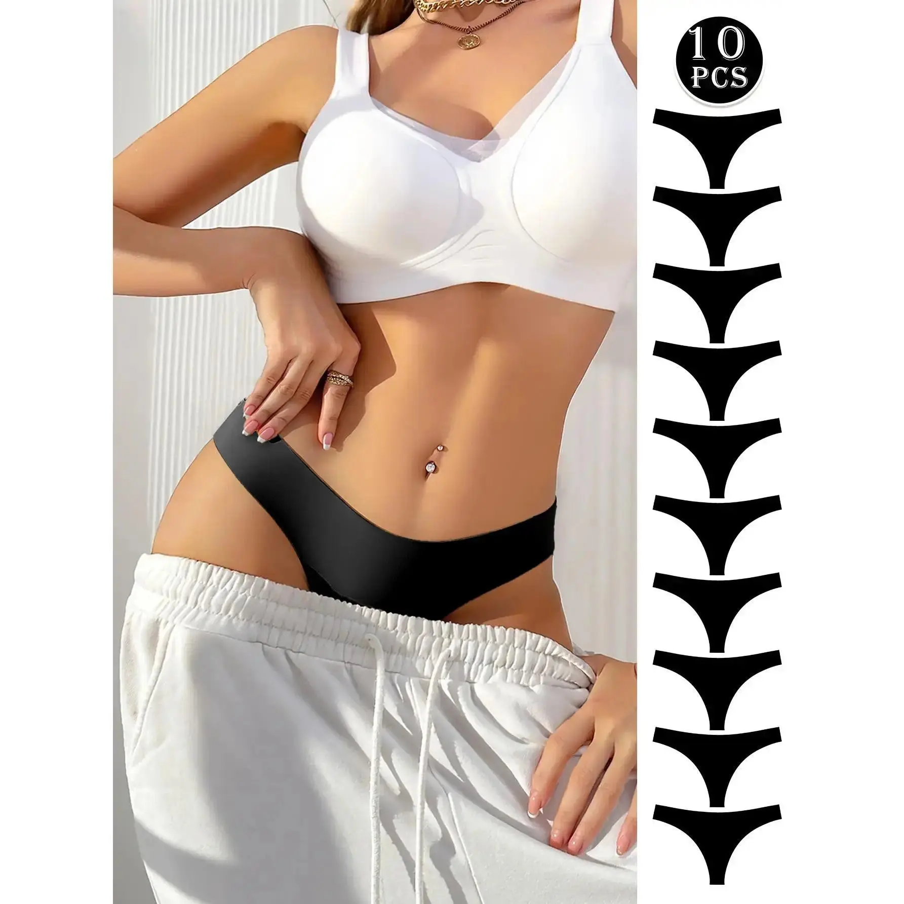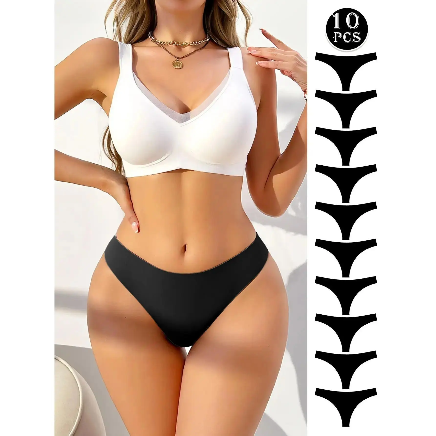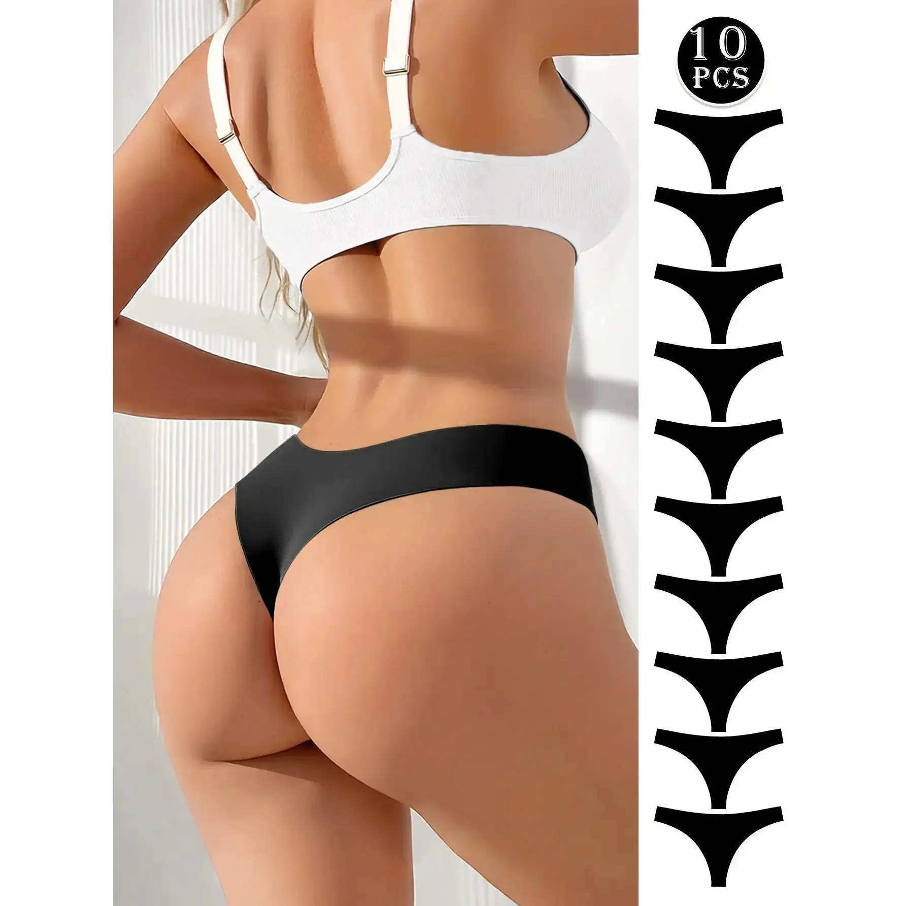 Women's 10Pcs Black Thong Underwear Elevate Your Everyday Style Hotcom Women's Lingerie Set with G-String offers comfort and style. These thongs come in a stylish black color, perfect for matching various outfits. Soft and comfortable, they ensure all-day wear. The breathable material guarantees comfort throughout the day. Seamless Design & Multifunctionality Seamless Design: Provides a smooth appearance. Multifunctionality: Suitable for all seasons, making it a versatile addition to your wardrobe. Set Details: Choose from 3pcs, 5pcs, 7pcs, or 10pcs sets. Ideal for everyday use. Perfect for All Seasons These thongs are designed for all-season use. They are a must-have for your everyday life. The breathable material ensures comfort, making them perfect for daily wear.