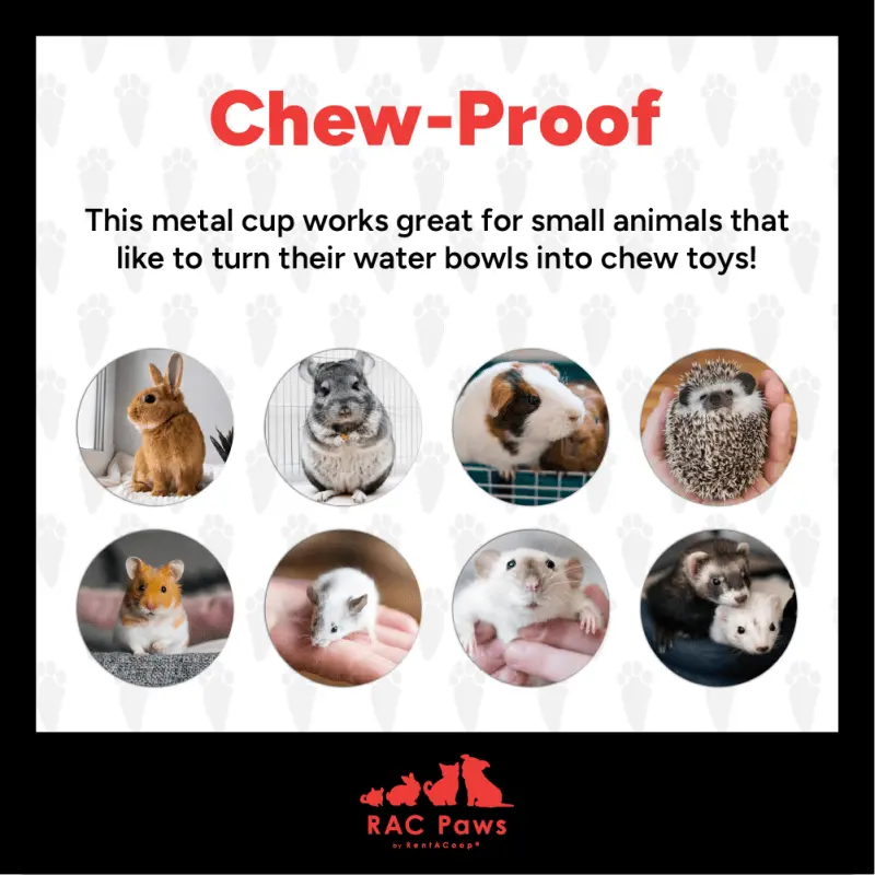 ·Chew-Proof Metal Cups: Unlike plastic cups that end up as chew toys, metal cups are less likely to damage and last longer. Works great for rabbits, guinea pigs, chinchillas, mice, rats, ferrets, hamsters, hedgehogs, and other small animals