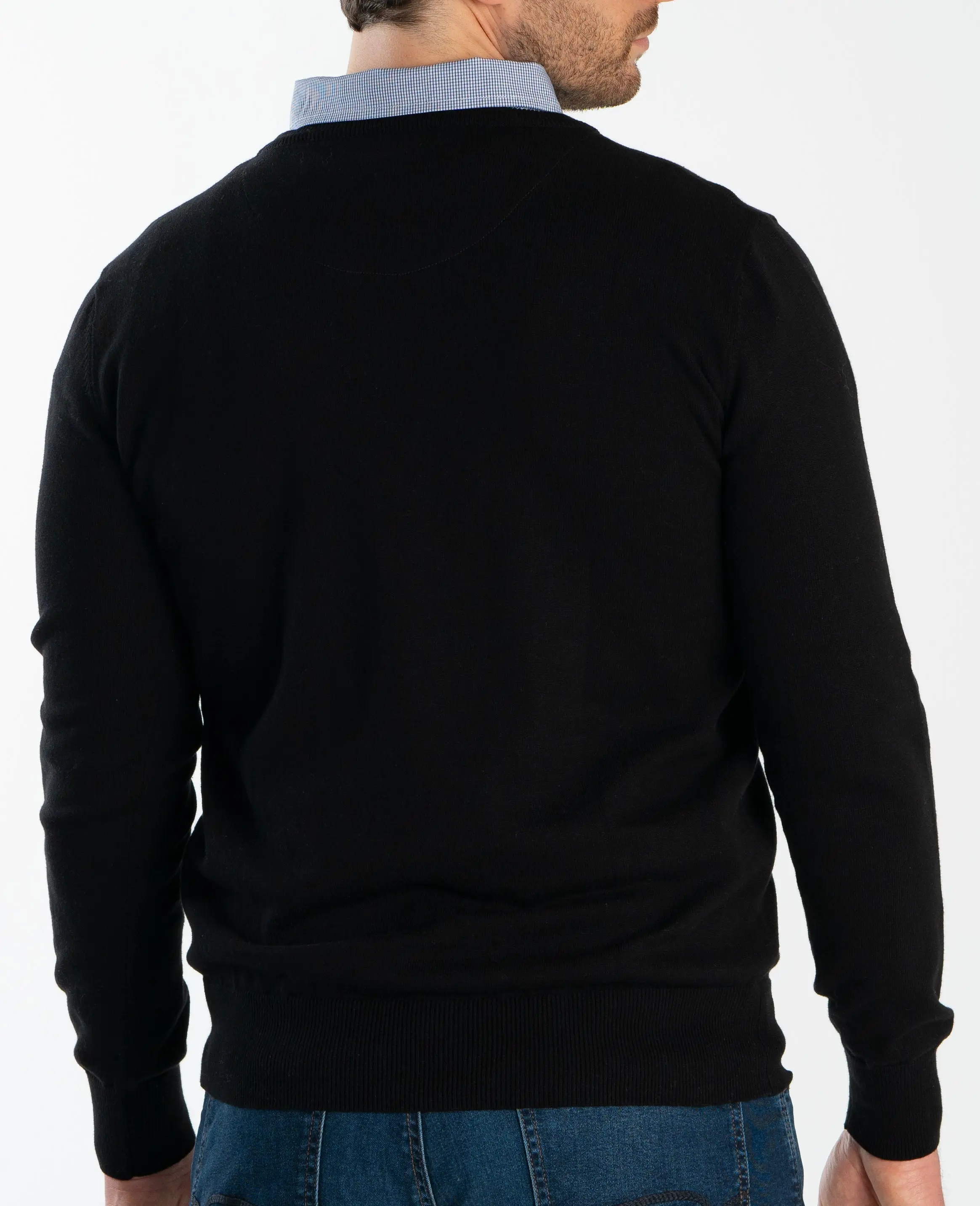 Our high quality, 100% cotton sweater in black has the bonus of an attached, micro gingham collar to give the appearance of a shirt and sweater combo with no one being the wiser.