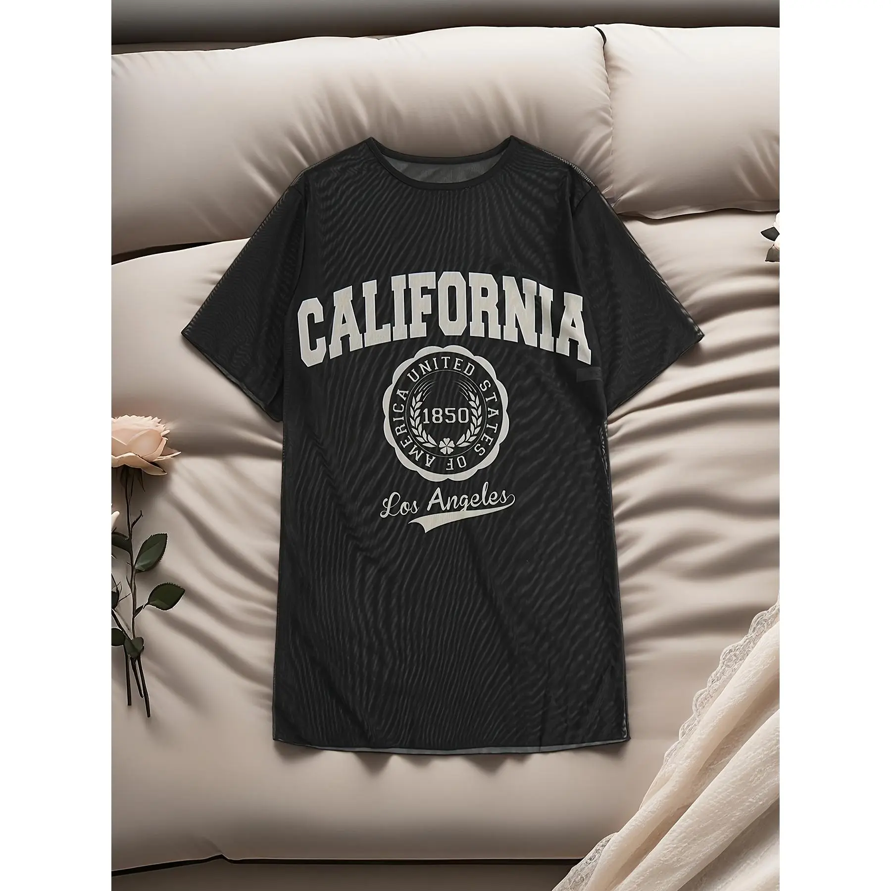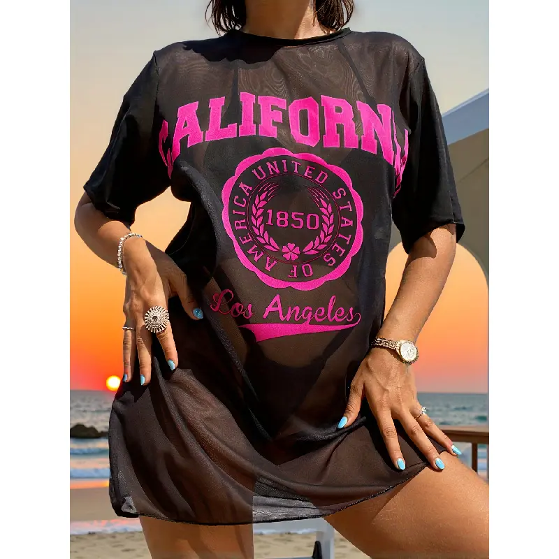 2026 Women's Beach Bikini Sunscreen Shirt, Summer Women's Beachwear, Fashionable Patterned Print, Casual Beach Apparel, Short Sleeve, Round Neck, Semi-Transparent Mesh Long Bodycon Cover-Up, Beach Vacation, Pool Party Sunscreen Clothing.