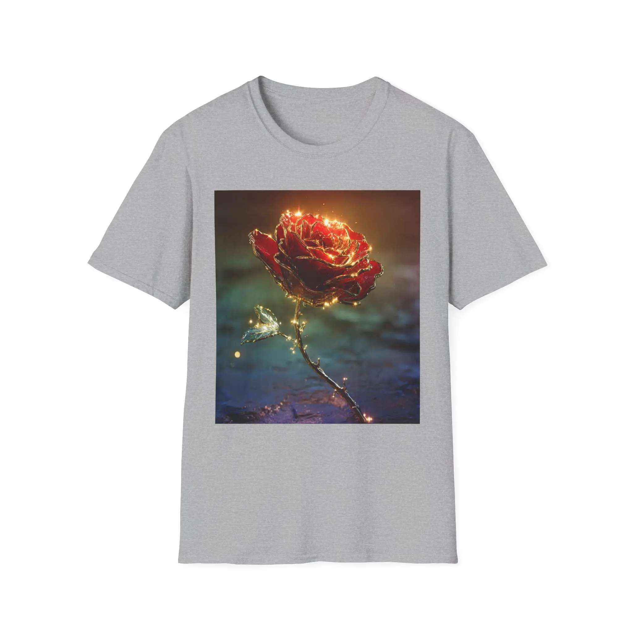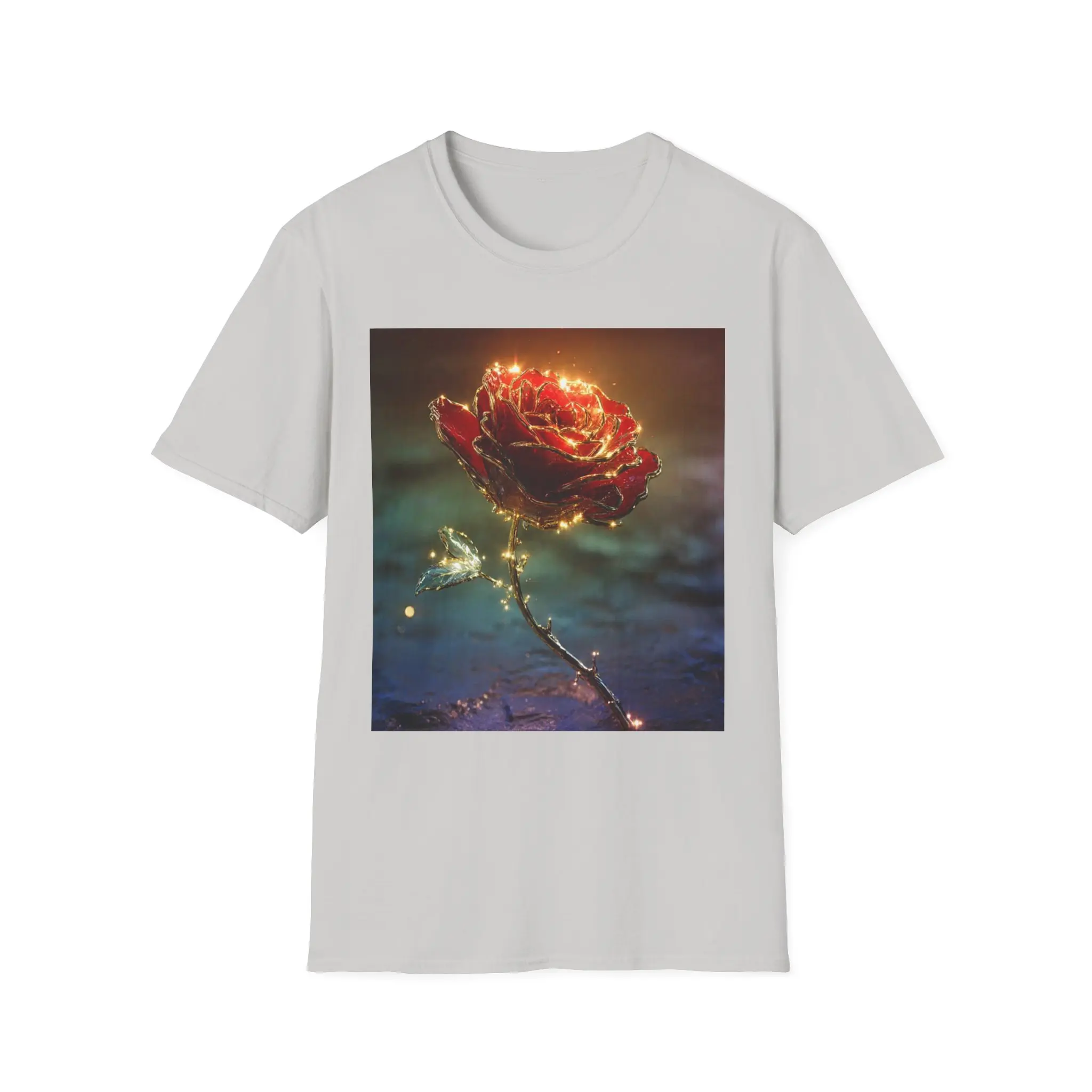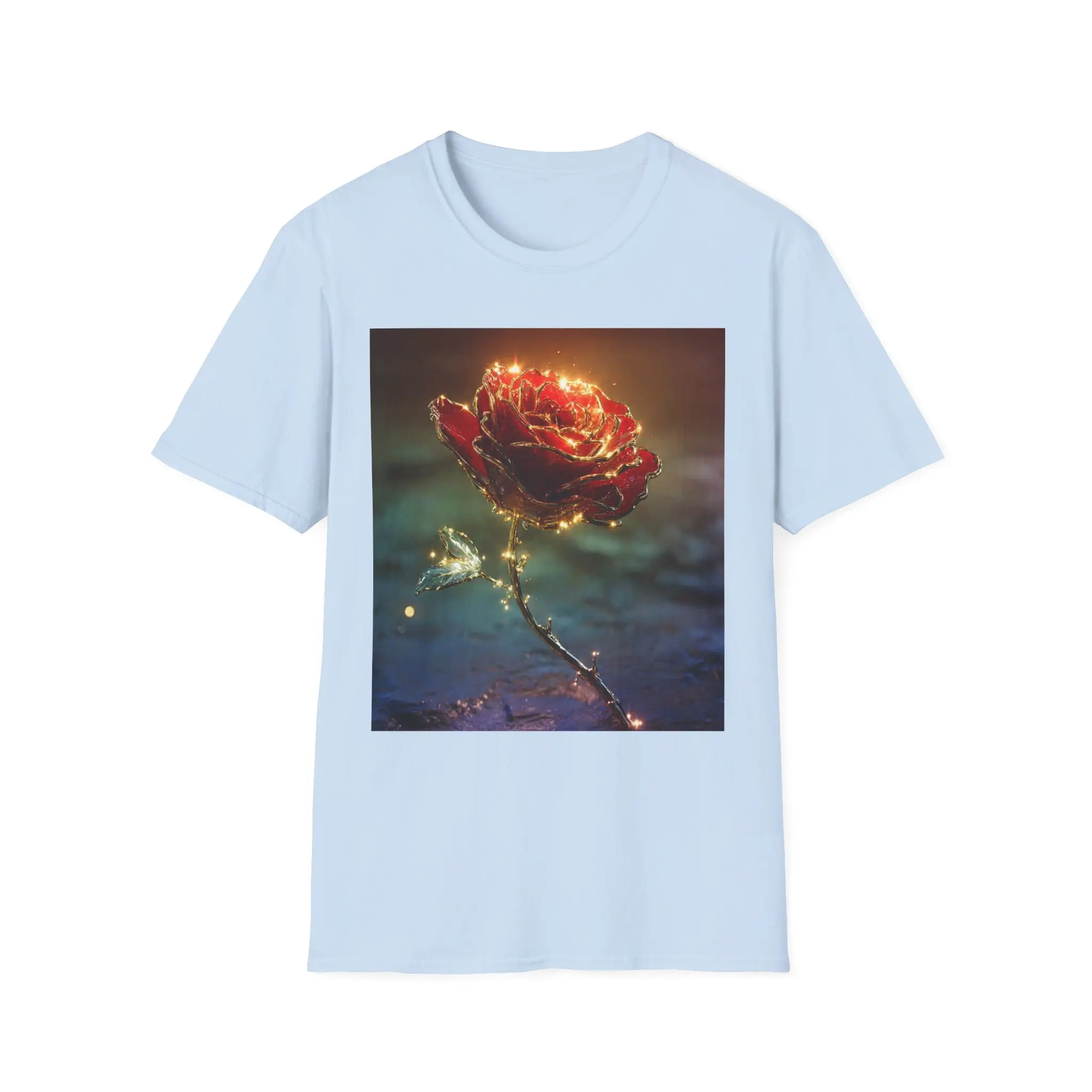 A lightweight cotton tee printed with a glowing, enchanted rose that seems lit from within. The square art sits centered on a clean white field, its warm golds and deep reds contrasting against soft, moody blues. Wear it on slow evenings, gallery walks, or quiet coffee dates — it adds a touch of poetic atmosphere without shouting. The fabric drapes easily, the crew neck holds shape, and the subtle tear-away label keeps the back of your neck comfortable. Care and materials are responsibly sourced and built to last, so the image stays vivid wash after wash.