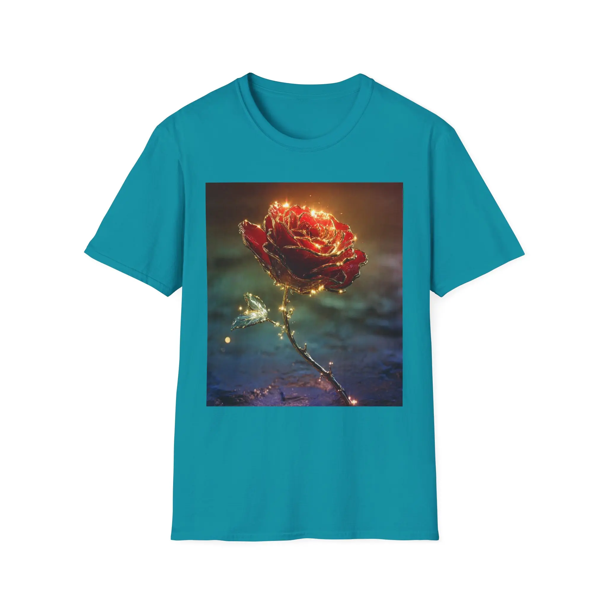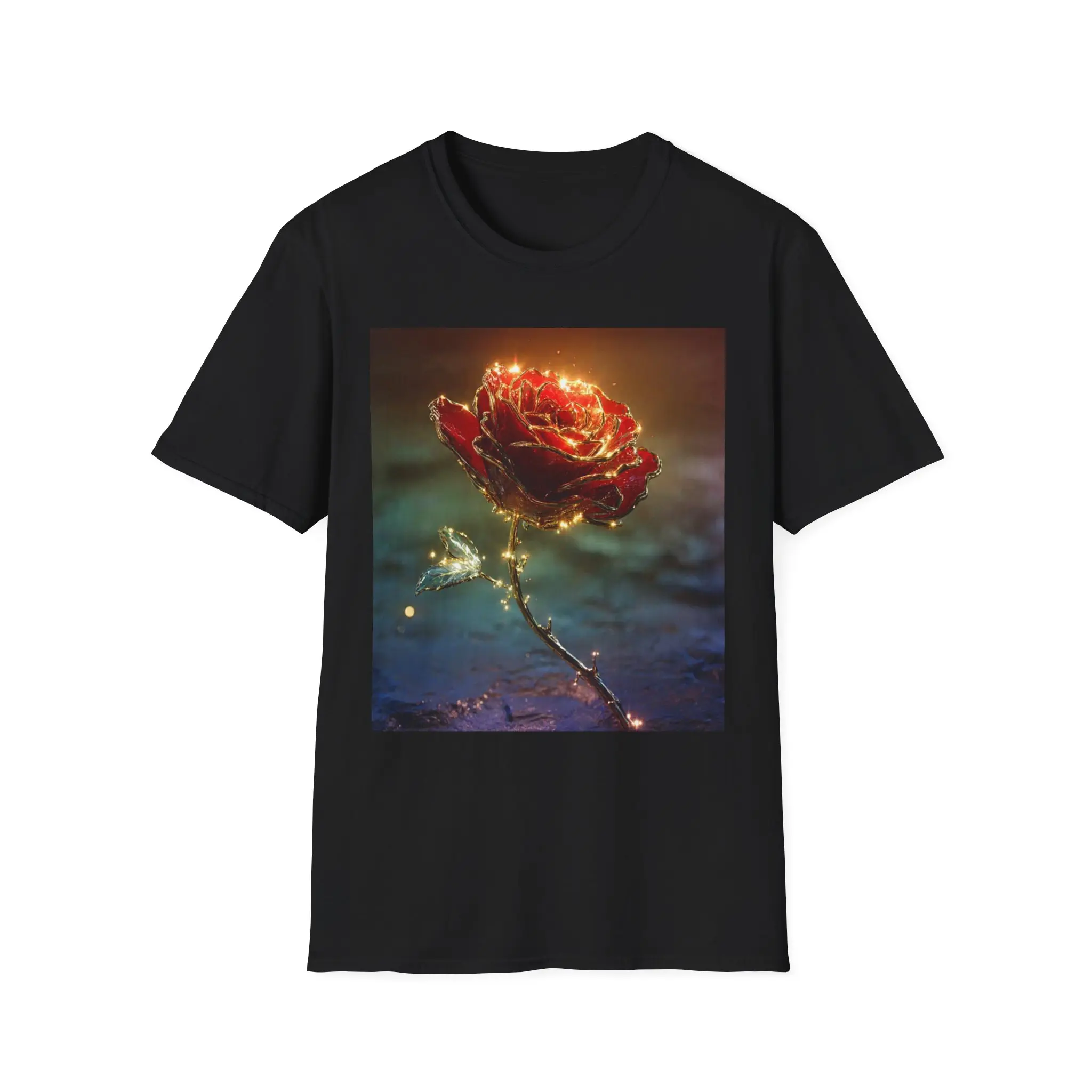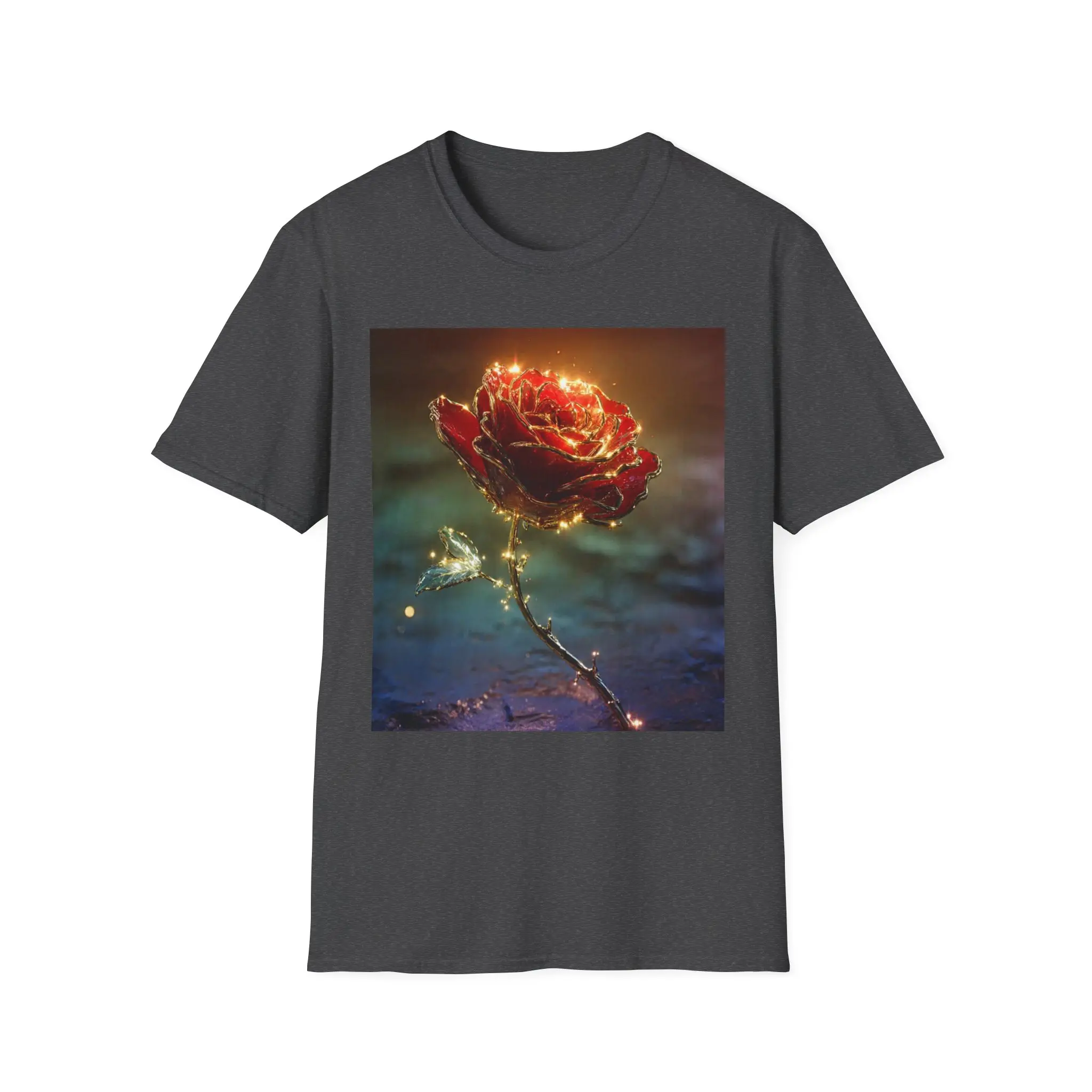 A lightweight cotton tee printed with a glowing, enchanted rose that seems lit from within. The square art sits centered on a clean white field, its warm golds and deep reds contrasting against soft, moody blues. Wear it on slow evenings, gallery walks, or quiet coffee dates — it adds a touch of poetic atmosphere without shouting. The fabric drapes easily, the crew neck holds shape, and the subtle tear-away label keeps the back of your neck comfortable. Care and materials are responsibly sourced and built to last, so the image stays vivid wash after wash.