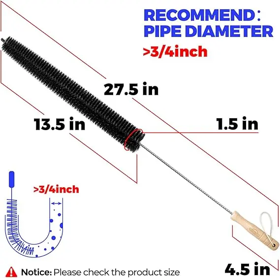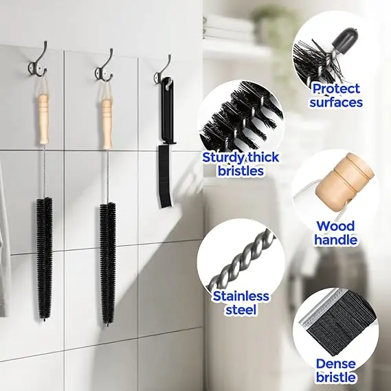 ·304 Stainless Steel & Solid Wood Handle: Anti-rust steel wire flexes around bends (up to 90°), thick bristles scrape stubborn buildup, Ergonomic wooden grip for comfortable control