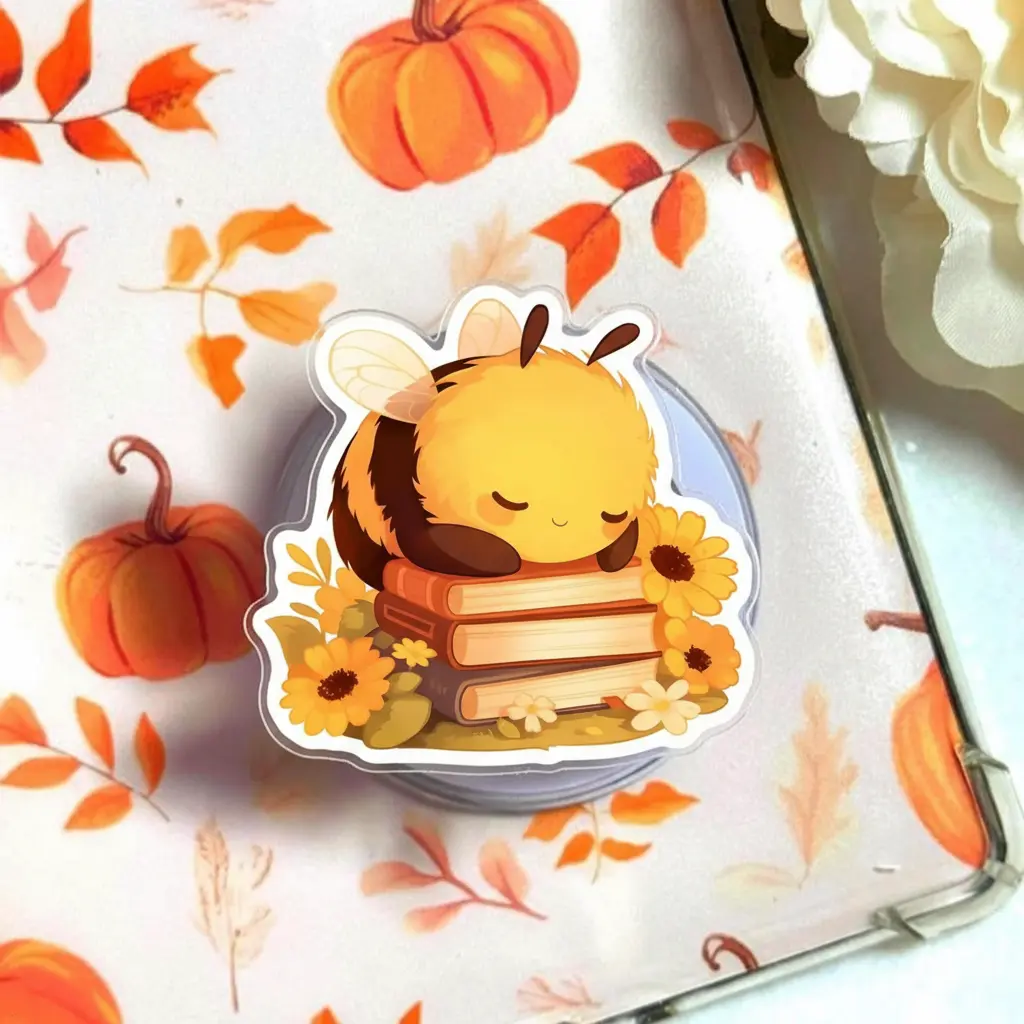 Cozy Bee Sleeping on Books Phone Grip, Aesthetic Spring Floral Magsafe Holder, Trendy Bumblebee Griptok, Cute Gift for Kindle Readers & Nature Lovers