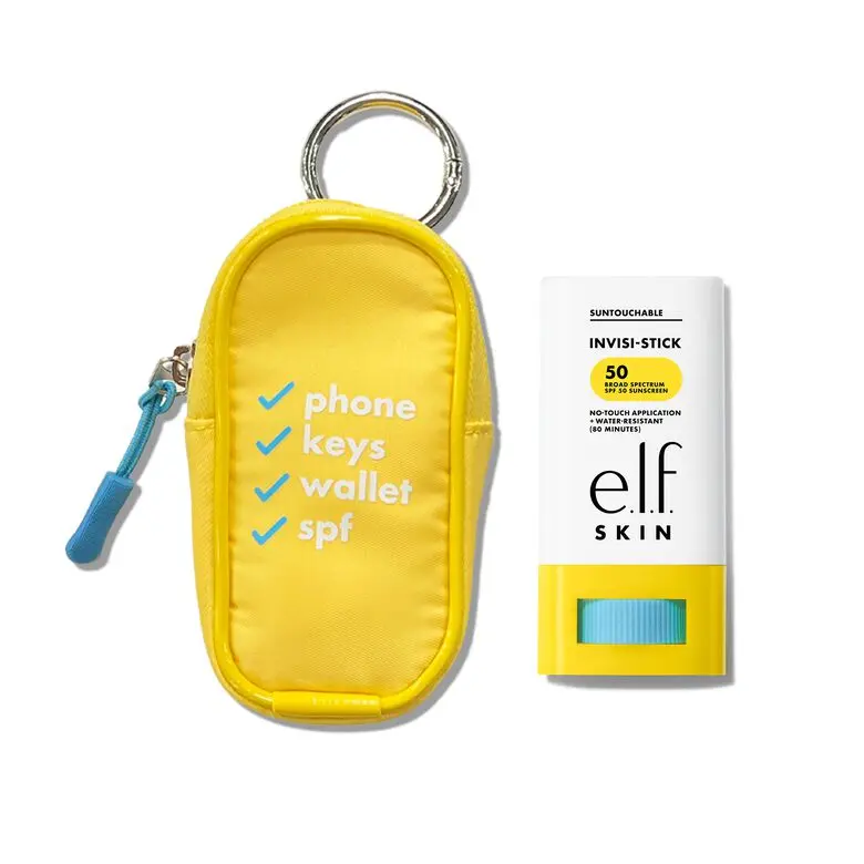 Phone, keys, wallet—and SPF. Skincare anywhere with this e.l.f. SKIN brightly colored polyester Invisi-Stick Keychain Case that's sized just right to fit Invisi-Stick SPF 50 Glitz. Just zip, clip and then never skip sun protection.