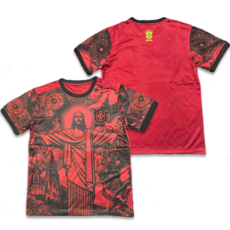 ·Design Highlights: Features an intricate all-over tonal pattern inspired by Brazil's natural wonders, including macaws, Sugarloaf Mountain, beaches, musical notes, and iconic architecture. The CBF (Brazilian Football Confederation) crest is centrally positioned—a nostalgic tribute to the legendary 2004 Copa América-winning jersey. It has a green double V-neck collar and green trim on the cuffs.