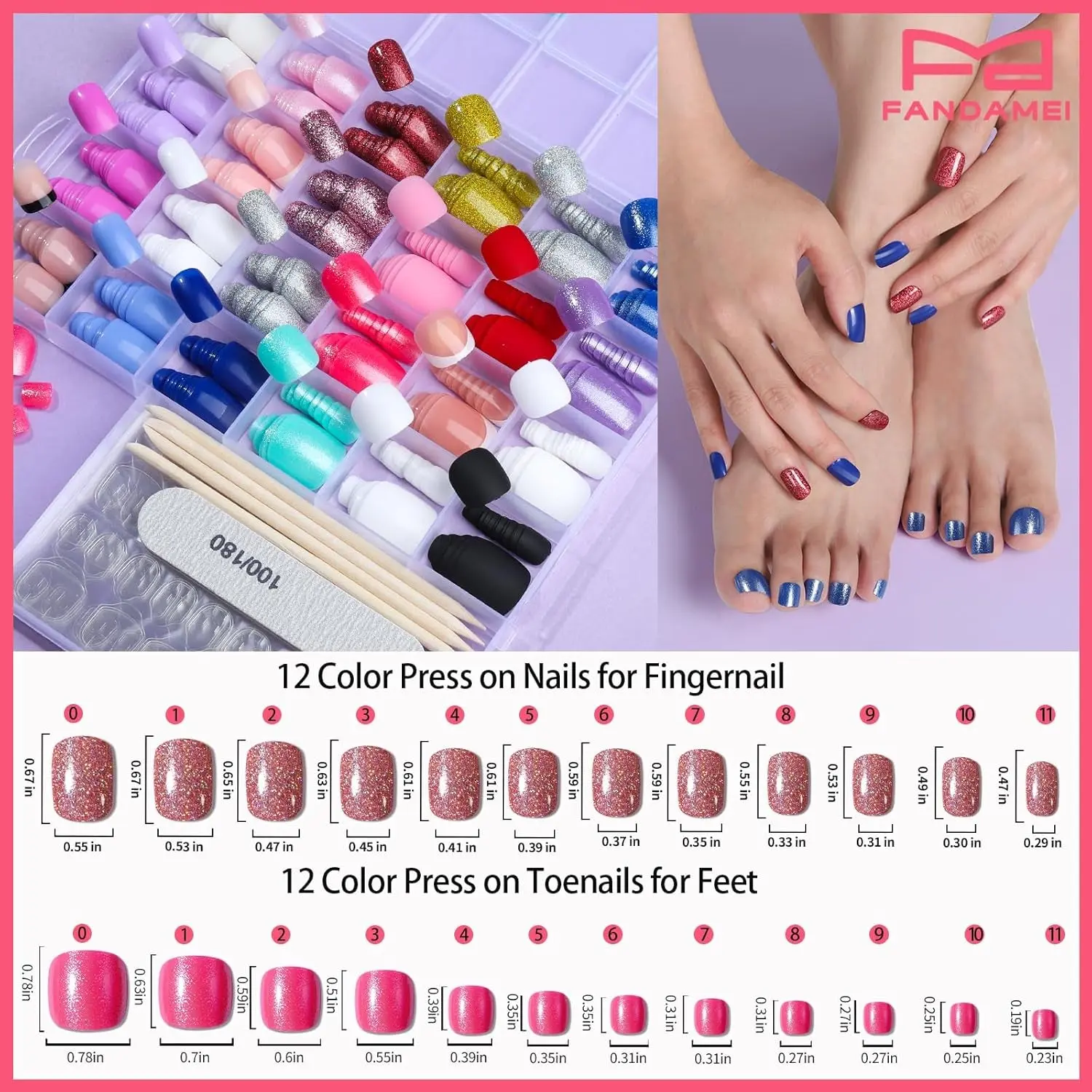 ·Press on Nails for Hands and Feet Set: 12 colors 288pcs press on nails short+ 12 colors 288pcs press on toenails short. Total 24 colors includes various styles and patterns. 10 sheets 240pcs adhesive nail tabs, 5pcs orange nail sticks and 1pcs 100/180 nail file. You can match the manicure and pedicure freely as you like. Decorate your fingernail and toenail at the same time. One sets includes 24 styles press on nails short and essential tools to wear press on nails.