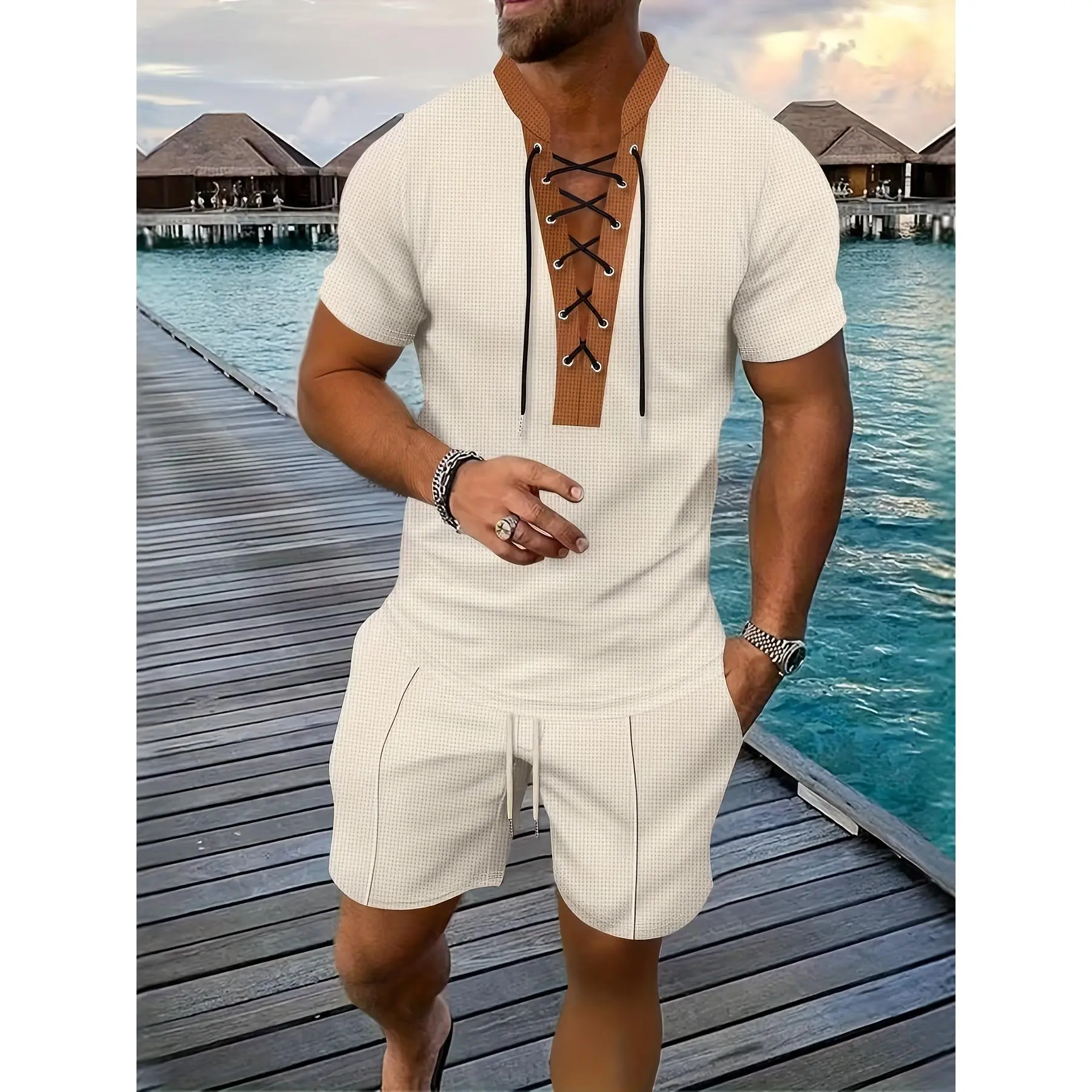 Coofandy Men's Summer Beach Outfit 2-Piece Short Sleeve Shirt & Shorts Set in Premium Linen Texture Fabric for Vacation & Casual Wear