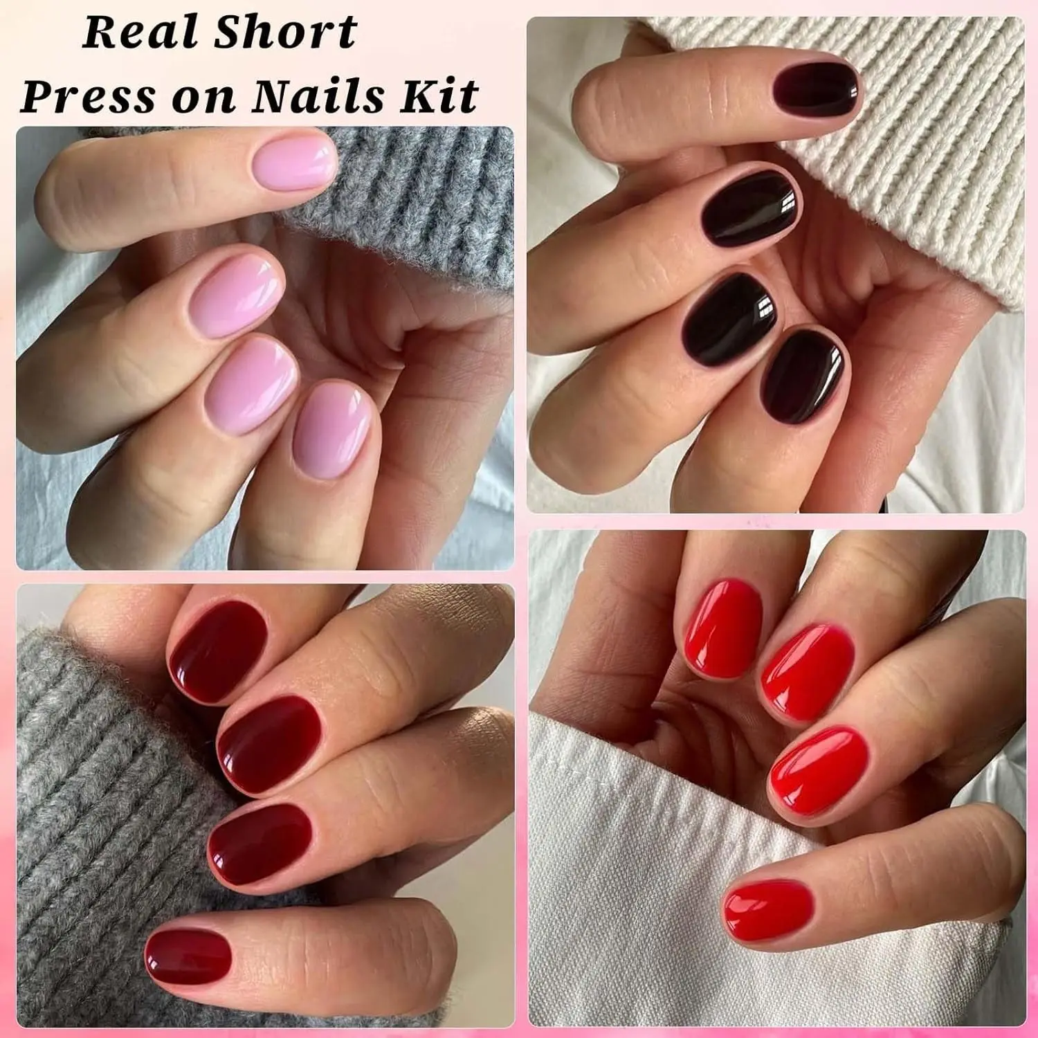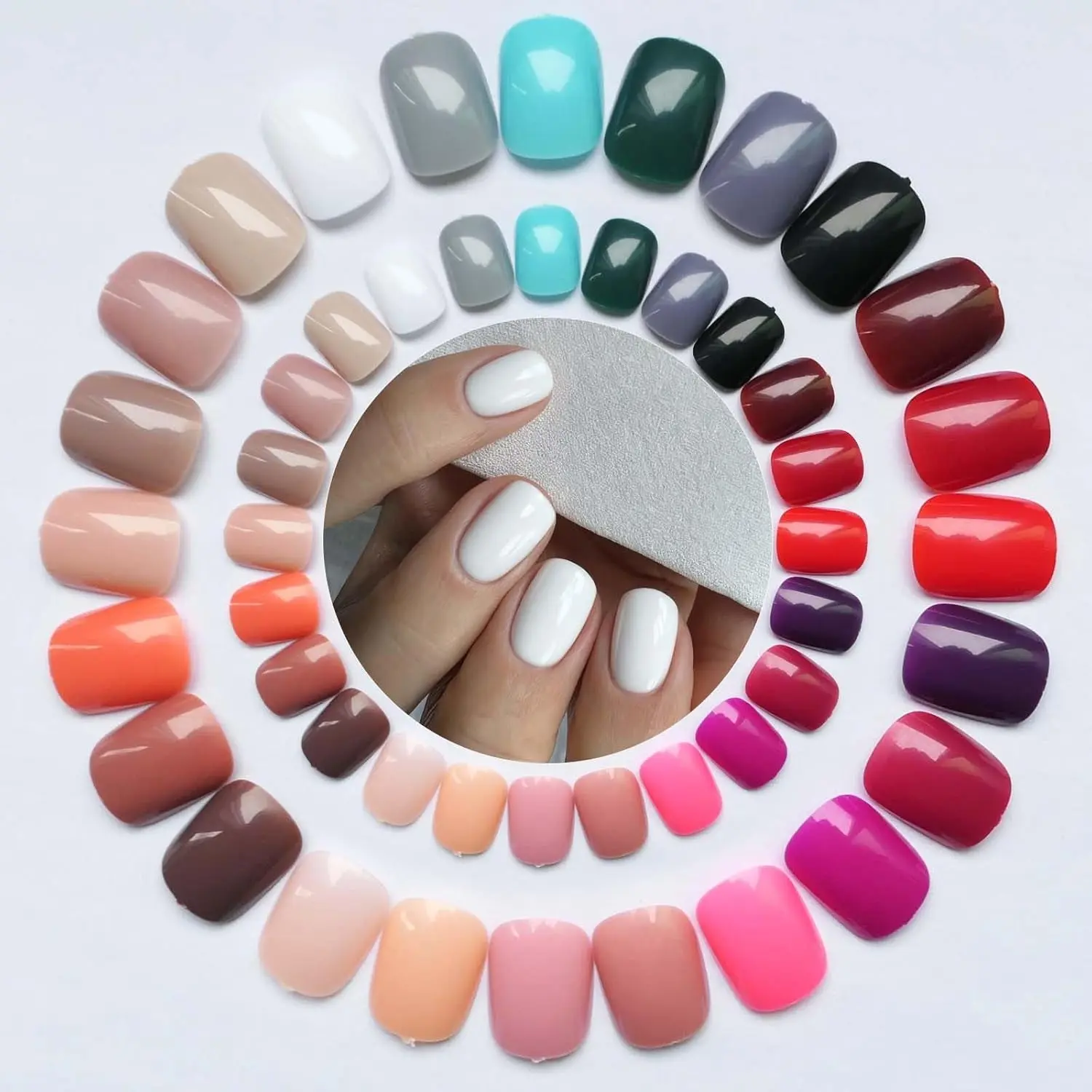 ·Kids short artificial nails contains 24 shiny trendy colors, your will got burgundy nails, turquoise nails,white acrylic nails, red press on nails, hot pink nails, grey nails,peevish nails, nude nails, green nails, jelly nails, petal pink nails, black nails, cherry nails, tapue nals, purple nails, brown nails, fushia nails, khaki nails etc. Colors are stylish and gorgeous for all years around.