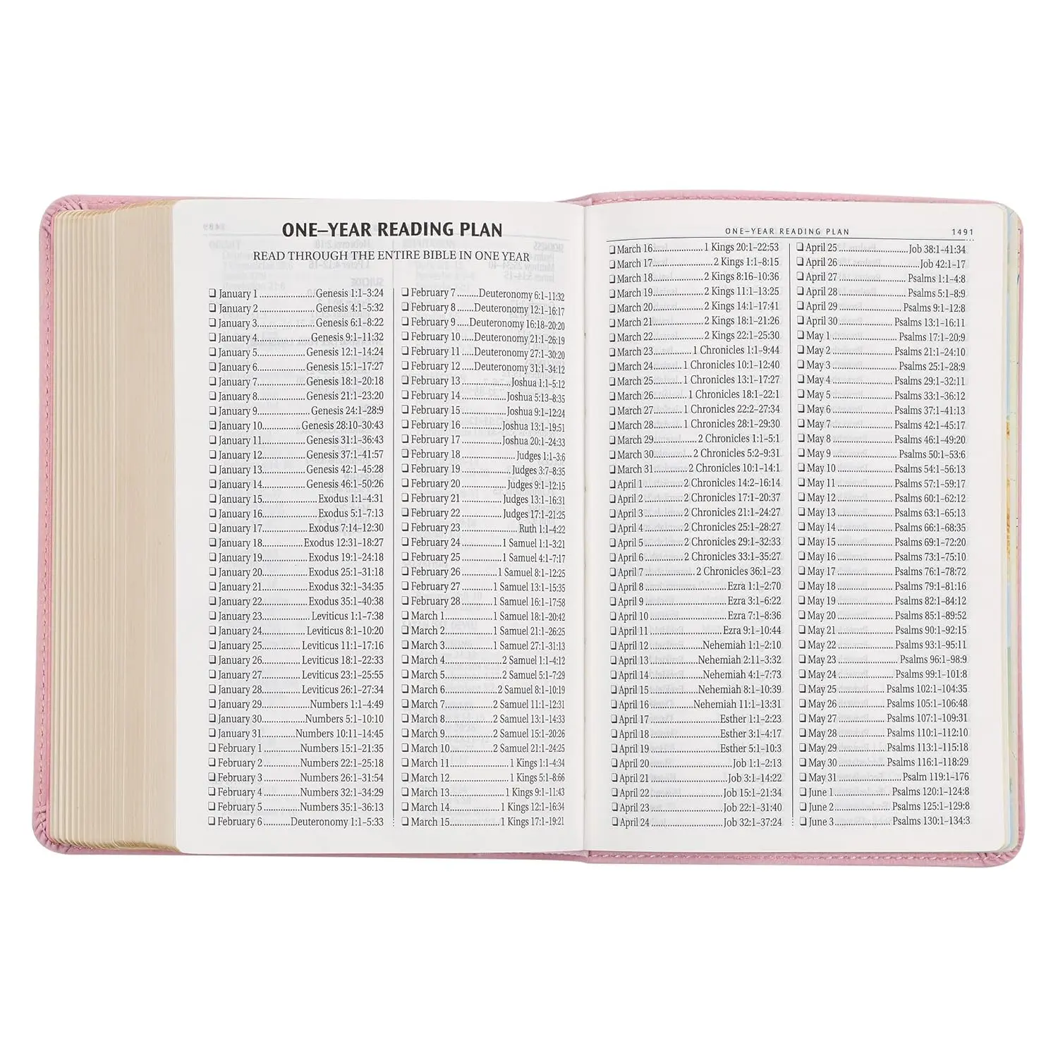 This Bible features a charming ballet pink faux leather cover with a floral outline design. The title "HOLY BIBLE KING JAMES VERSION" is elegantly presented in gold-foiled letters. Gilt-edged pages and a pink satin ribbon marker add elegance and convenience. The lay-flat Smyth-sewn spine displays the title in heat-debossed letters. It's an ideal birthday gift for moms, combining readability with thoughtful features.