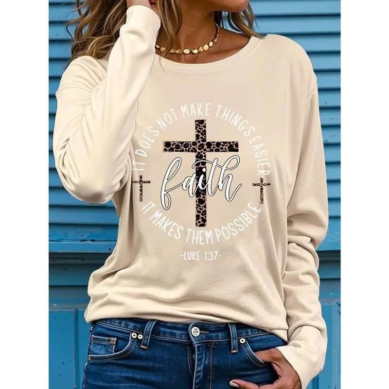Long Sleeve Inspirational Faith Quote Polyester Sweatshirt For Women - Casual Crew Neck Slight Stretch Knit Fabric Pullover For