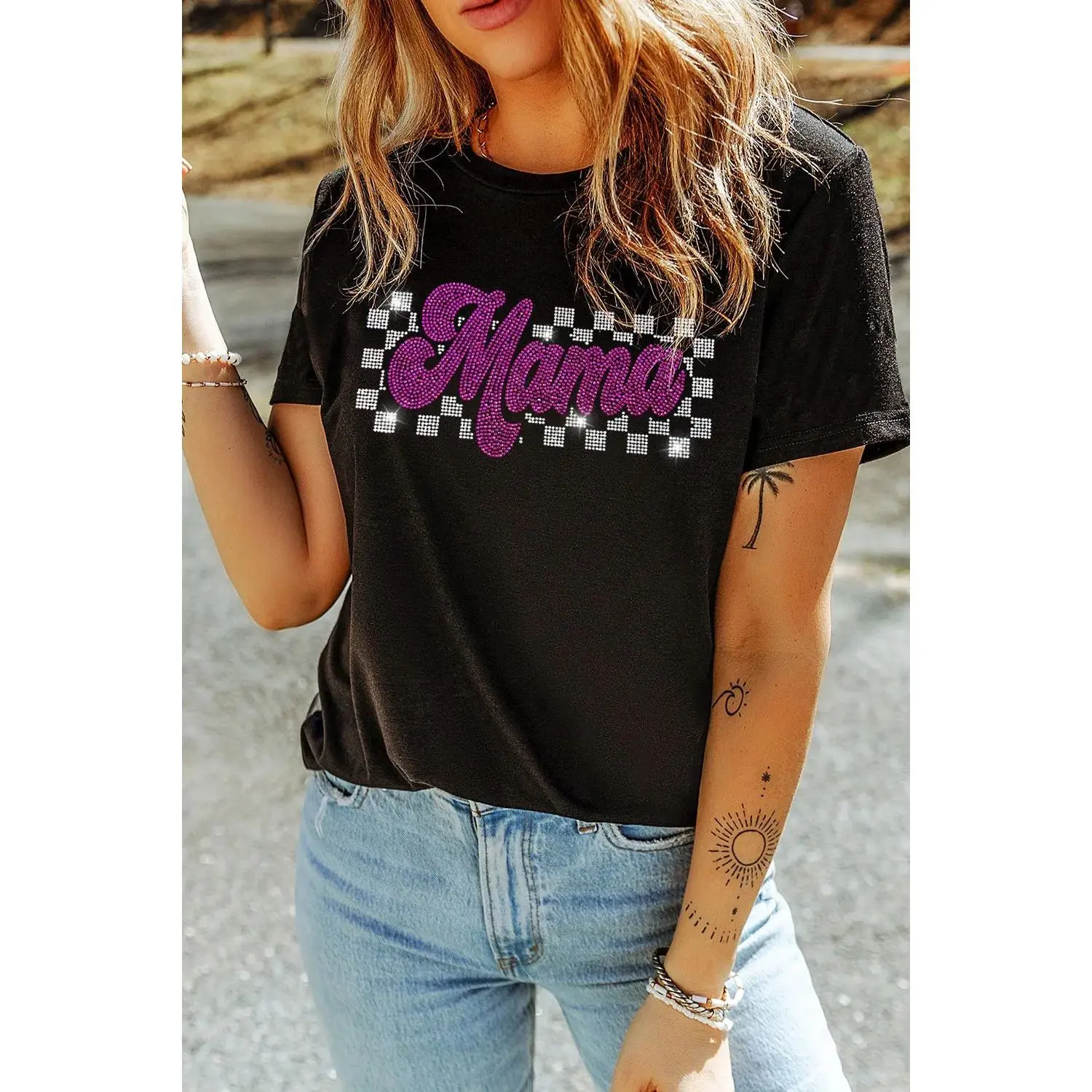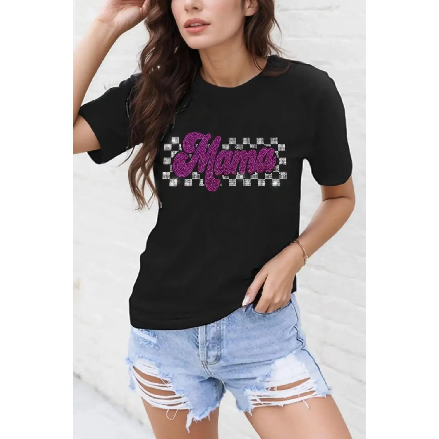 MAMA Rhinestone Letter Round Neck T-Shirt