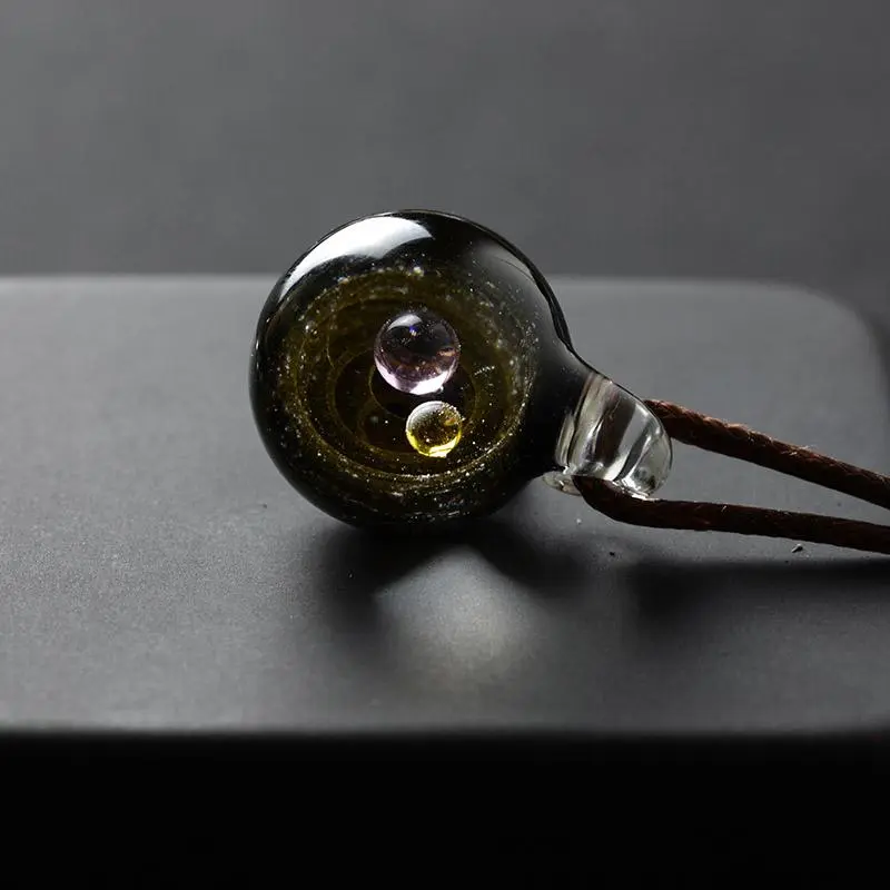 This glass pendant captures the essence of distant galaxies. Swirling nebula-like patterns evoke the motion of the cosmos. Small orb details reflect the rhythm and mystery of space. Each piece feels like a moment frozen in time—calm, expansive, and powerful. It’s not just an accessory; it’s a statement.