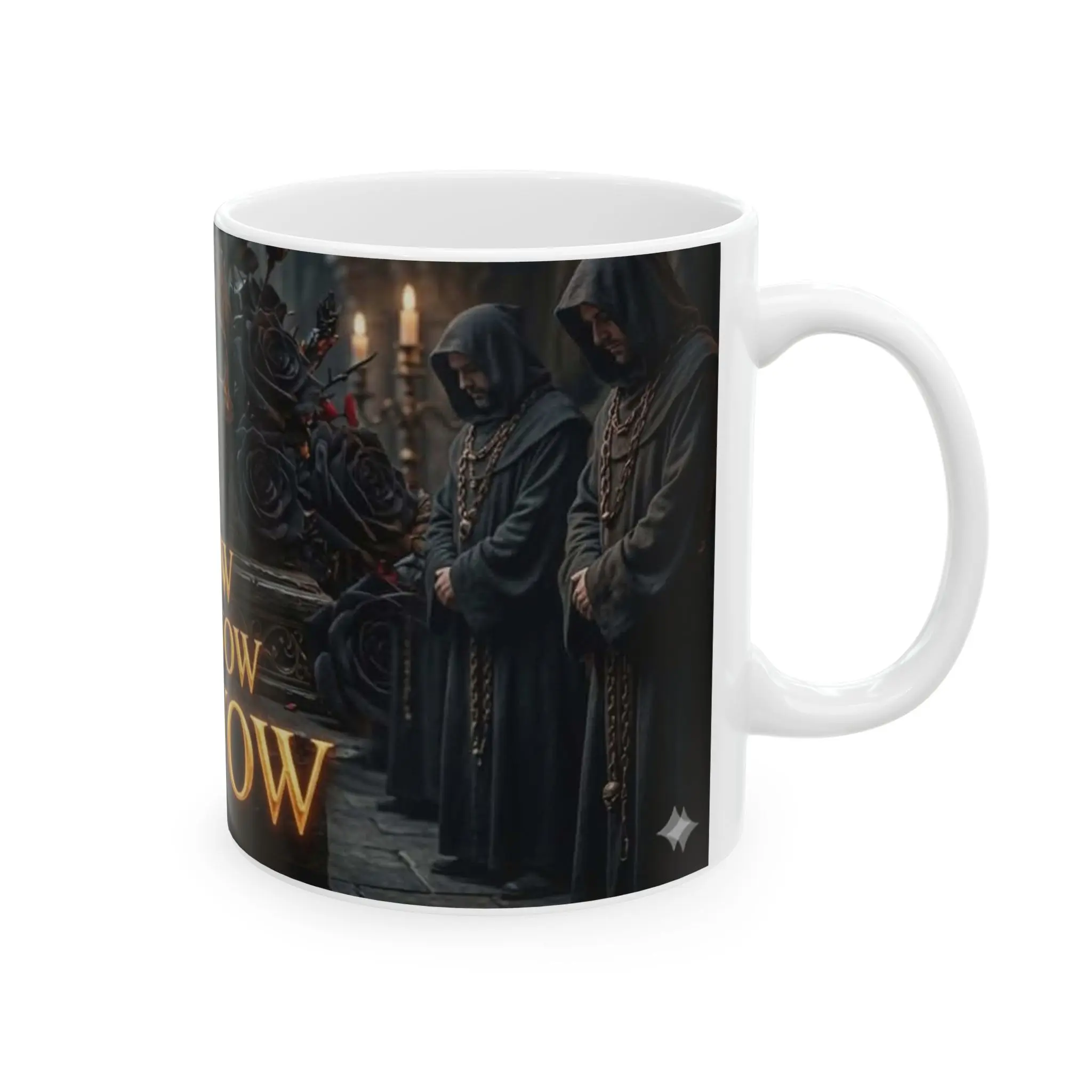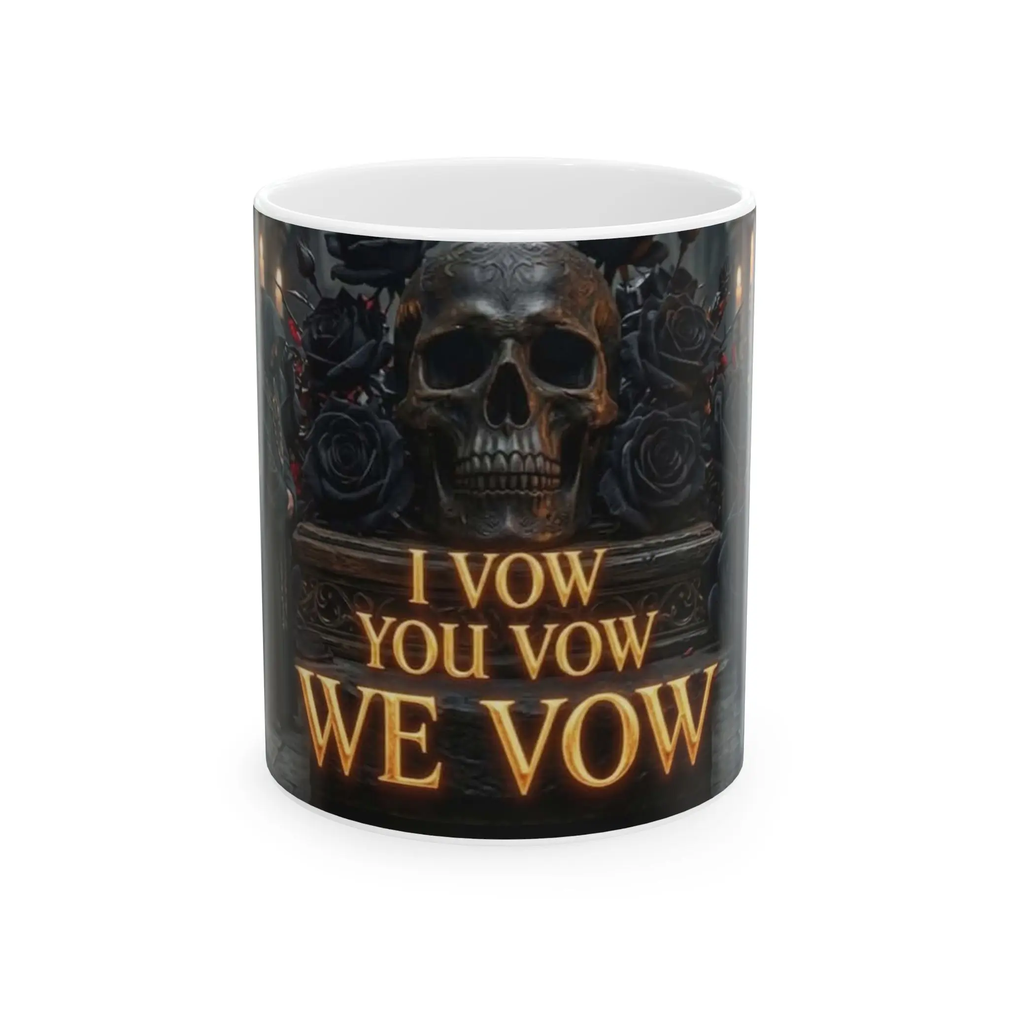 Dark, bold, and a little defiant — this glossy ceramic mug brings a touch of gothic romance to your morning ritual. A striking skull and black-rose motif frames the gold-lettered vow: “I VOW / YOU VOW / WE VOW.” Hold it warm in your hands and feel the weight of commitment, whether shared between partners or sworn by chosen family. The deep blacks and rich metallic tones keep their intensity through everyday use, so the message stays as clear as the coffee inside. This mug sits comfortably on a bedside table, next to a stack of vinyl, or beside a well-loved book — a small statement piece that speaks to those who celebrate loyalty with a dramatic flair.