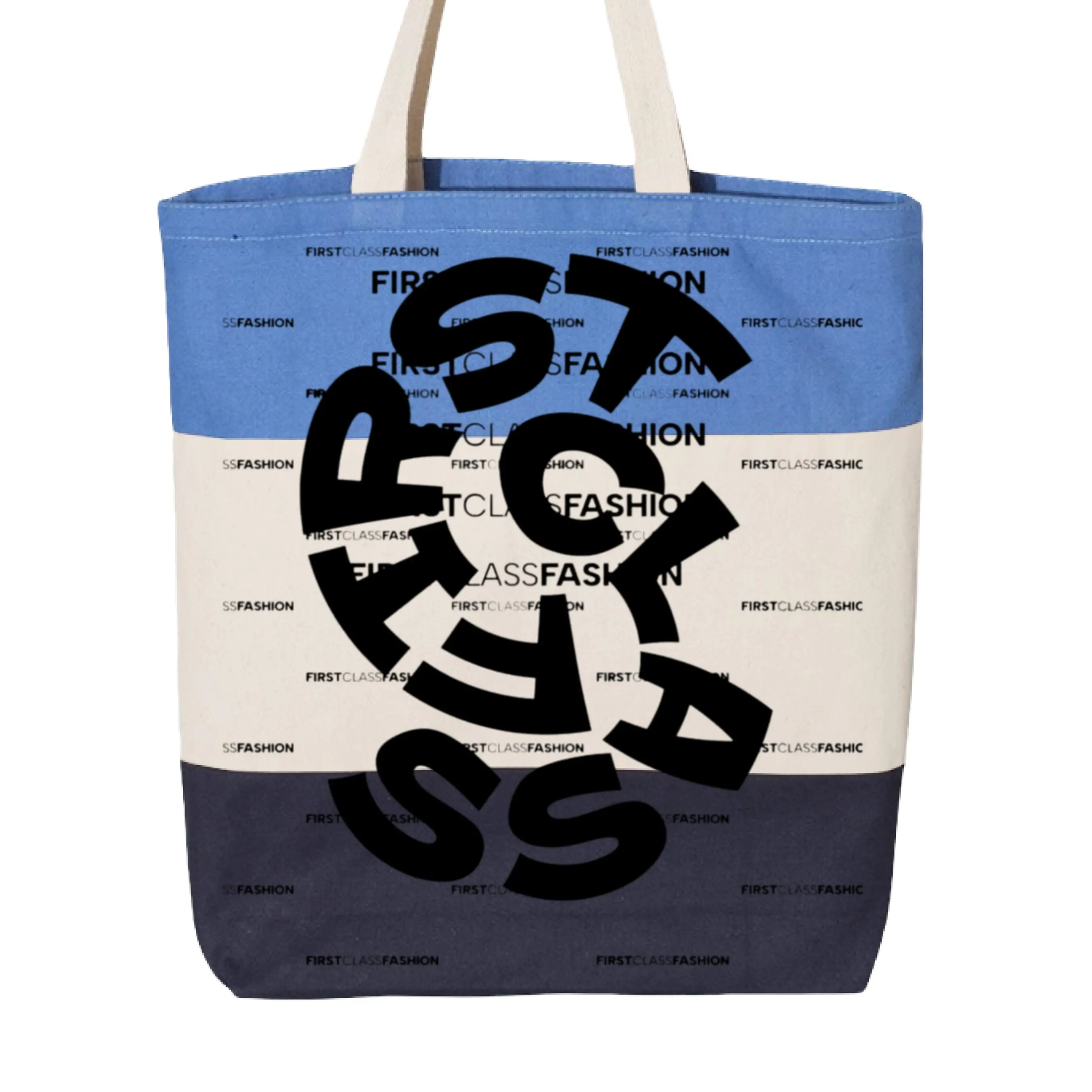 First Class Fashion BAG, 12 oz., made of 100% heavy cotton canvas, features 20” natural webbed handles with an 8” handle drop.