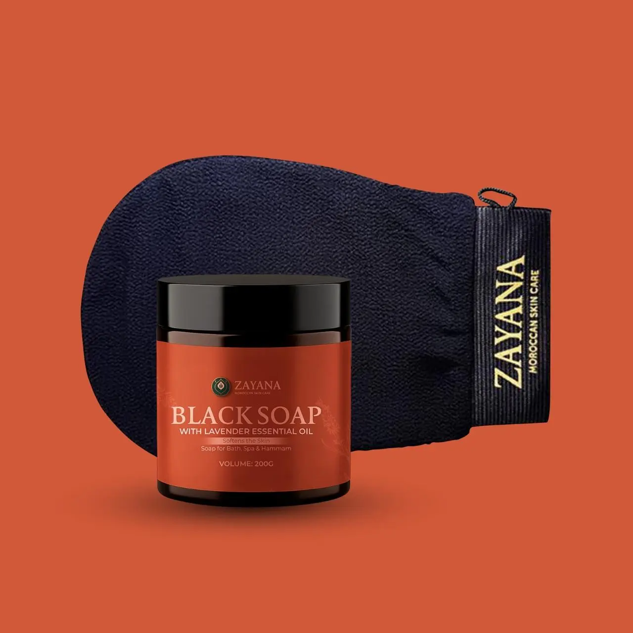 Zayana Moroccan Black Soap & Kessa Mitt Set with Lavender Essential Oil for Soft Skin Deep Exfoliation 200g Hammam Spa for Luxurious Bath Experience