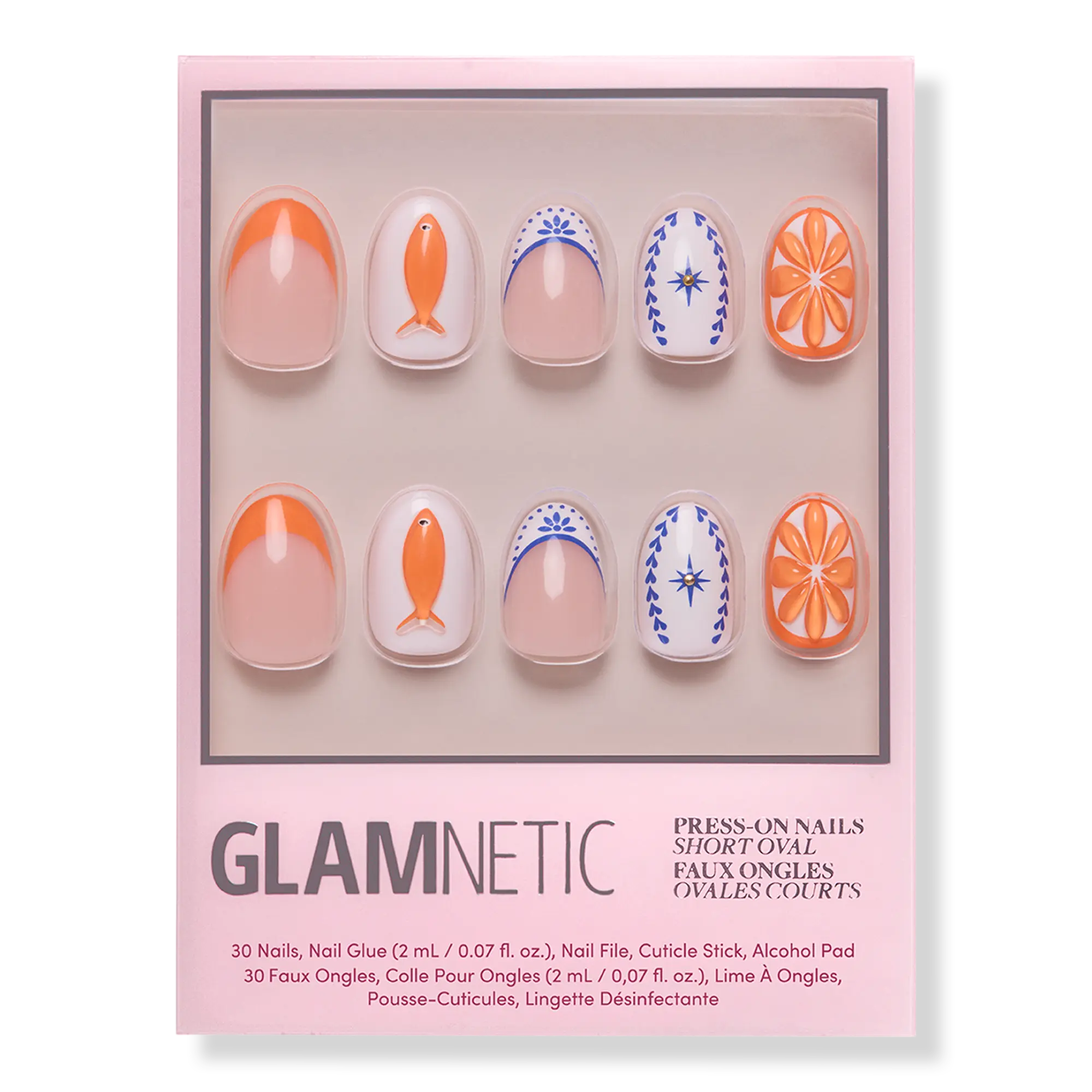 Your ticket to the Mediterranean. Glamnetic's Citrus Coast Press-On Nail Set is packed with a range of designs: 3D orange slices, bright 3D fish friends, and Greek ceramic prints. Mix and match these short oval nails however you’d like to get a salon-quality mani in 10 minutes.