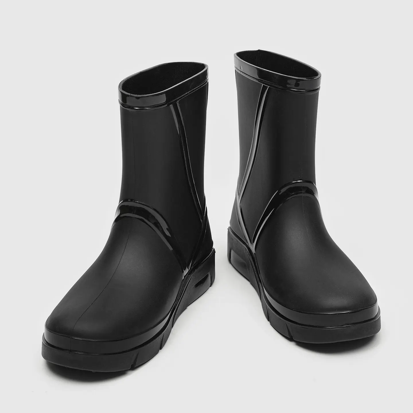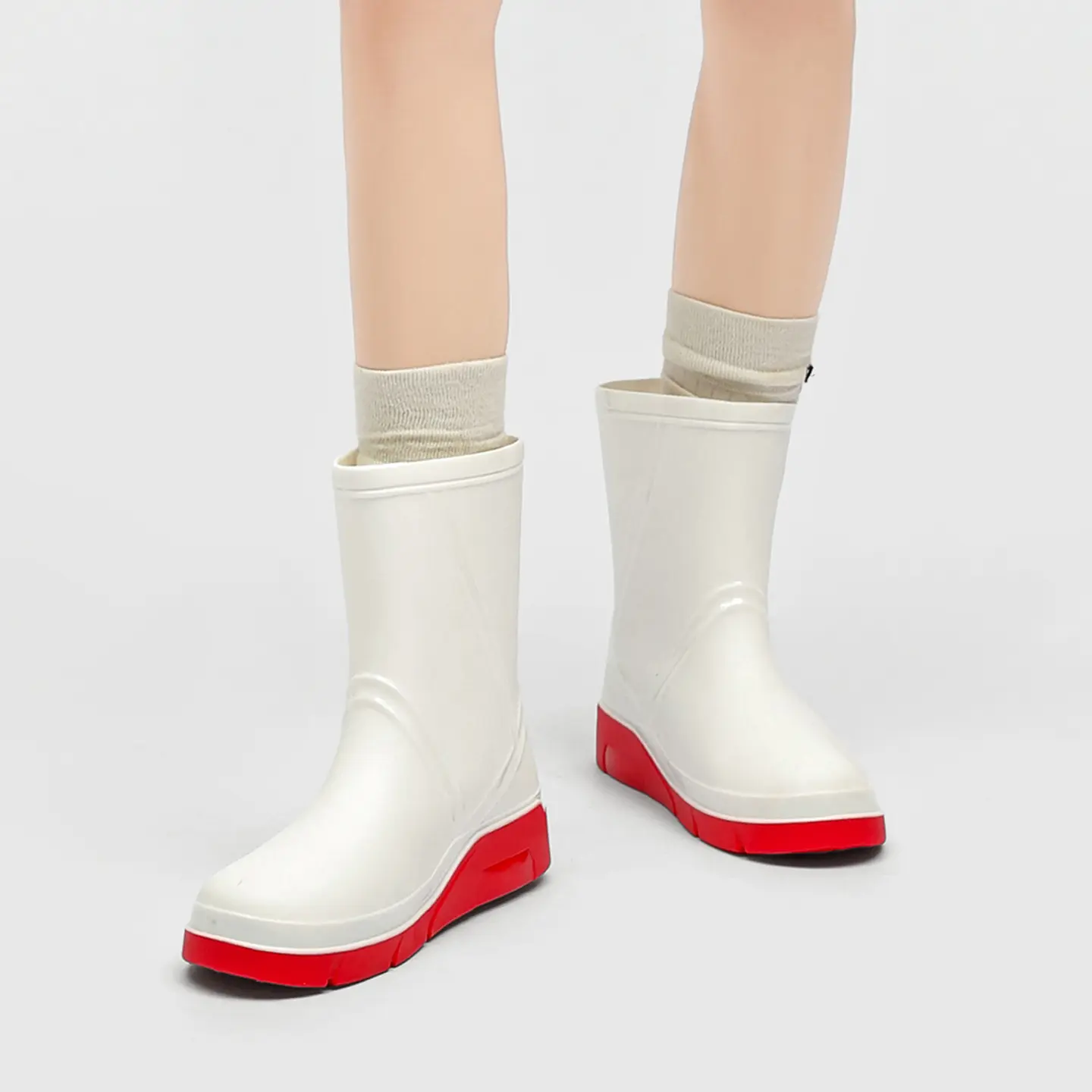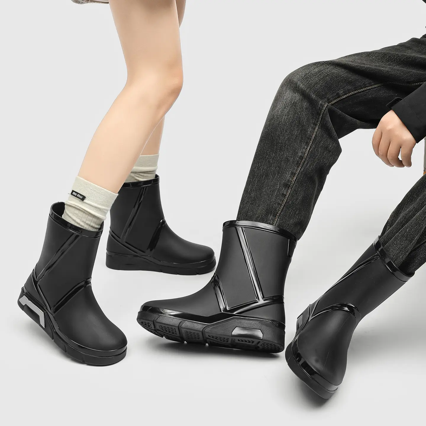 Looking for rain boots that look great and perform well? These fashionable mid-calf waterproof boots are your top choice. Available in black, white, and green; minimalist design with line details that create a glossy effect. Unique high heel details make the outerwear more eye‑catching. Suitable for commuting and outdoor wear. Full size range from 36 to 45; unisex design suitable for different foot types.