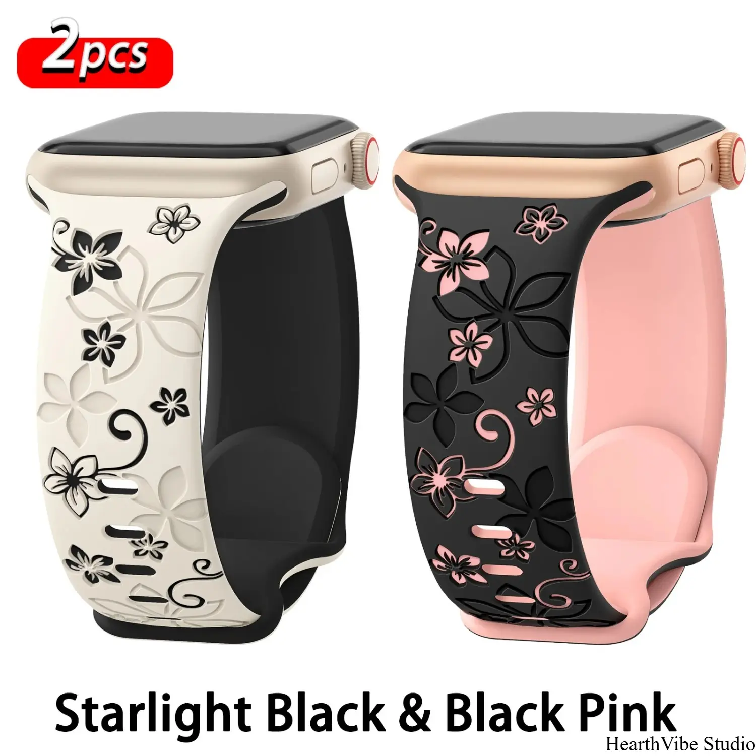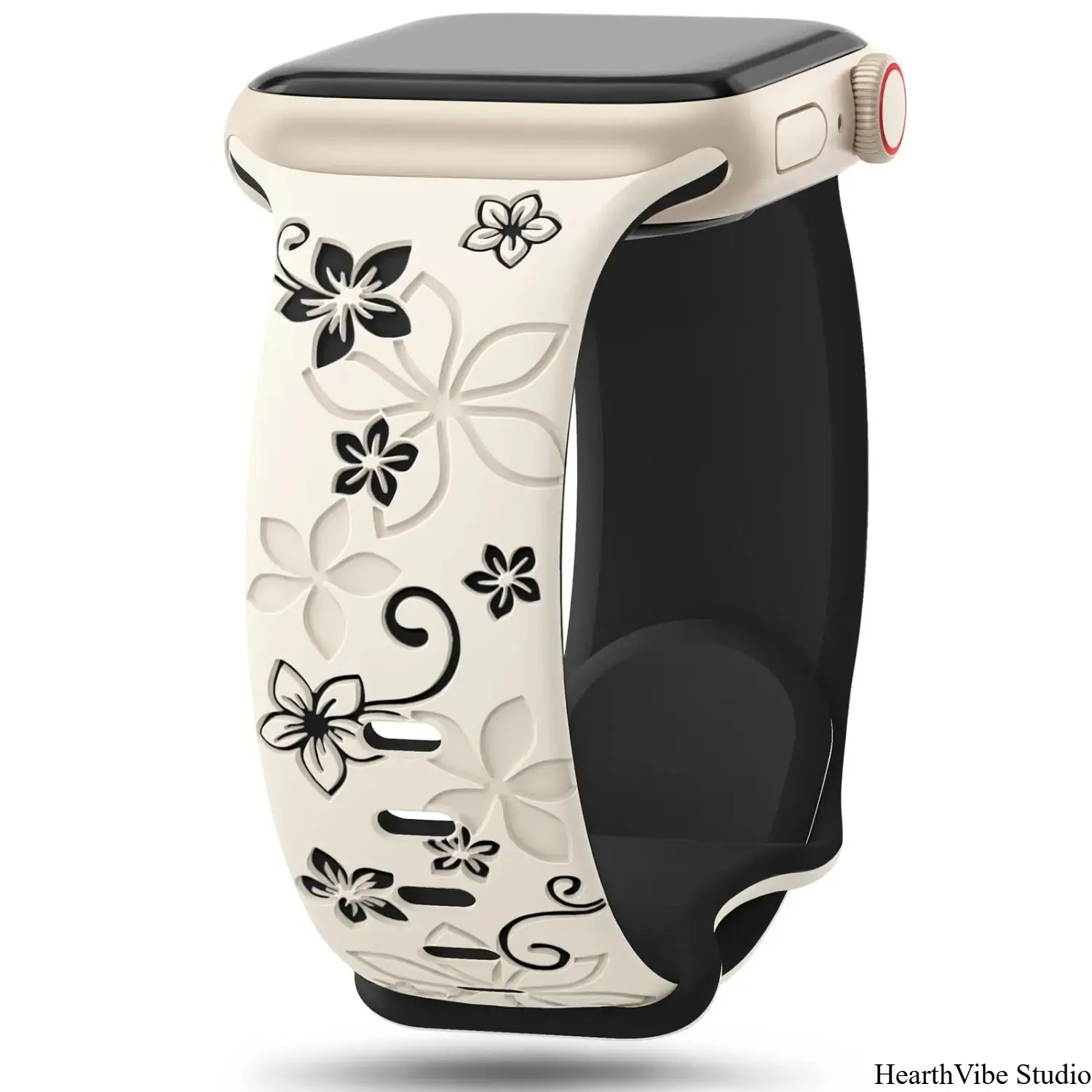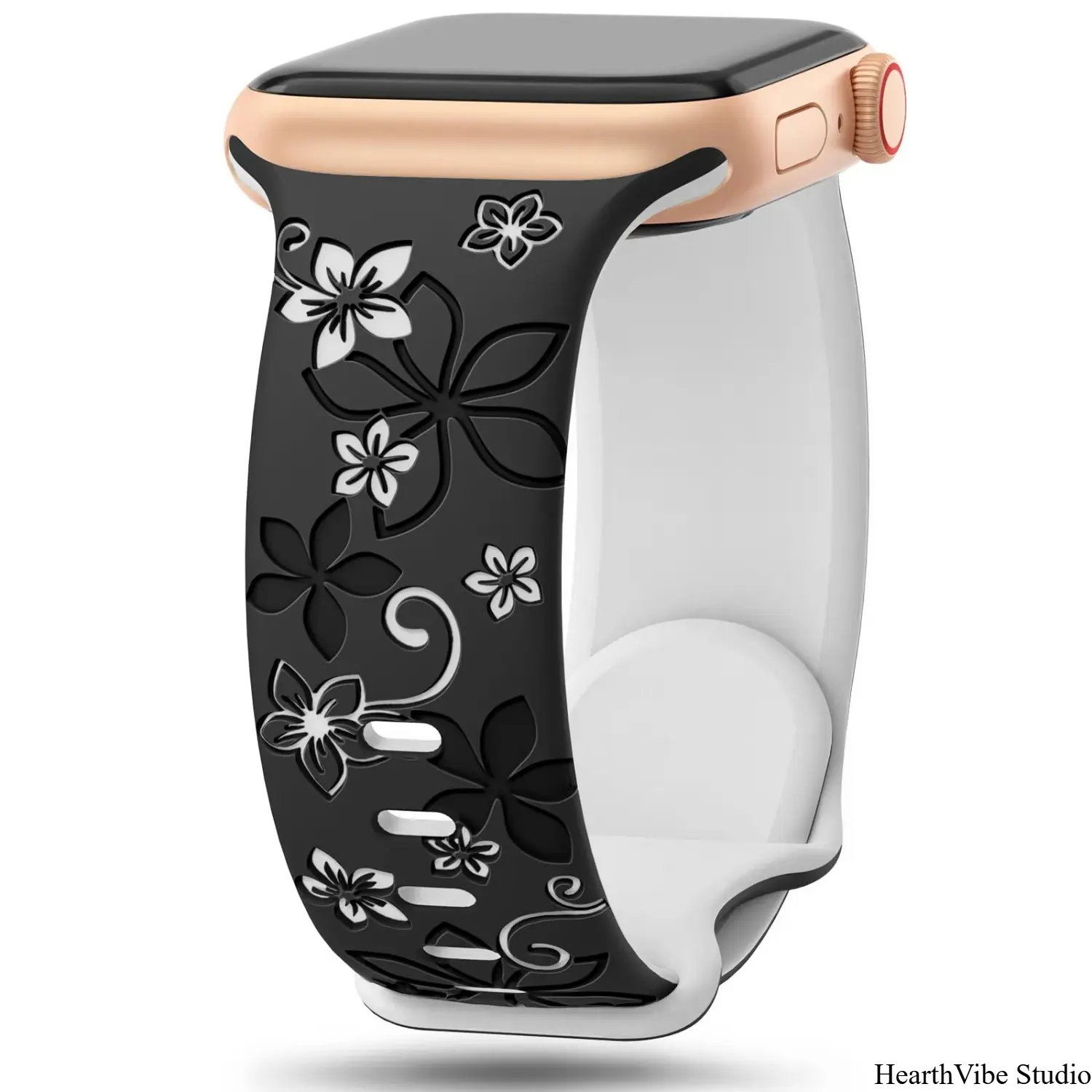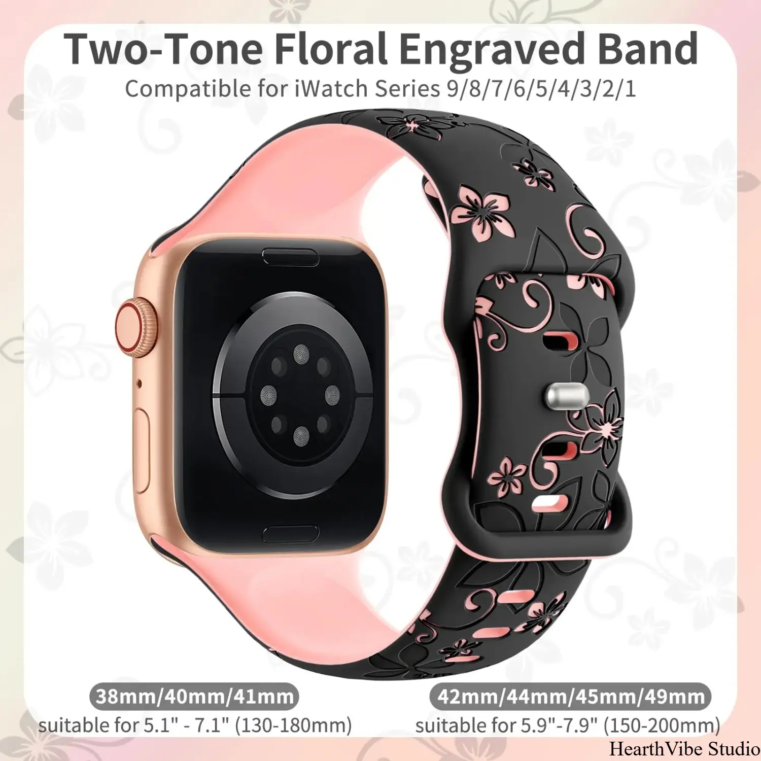 Floral Engraved Strap For Apple Watch Band 46mm 41mm 40mm 44mm 45mm 42mm 49mm Silicone Sport iWatch Series 11 10 SE 9 8 Ultra 2