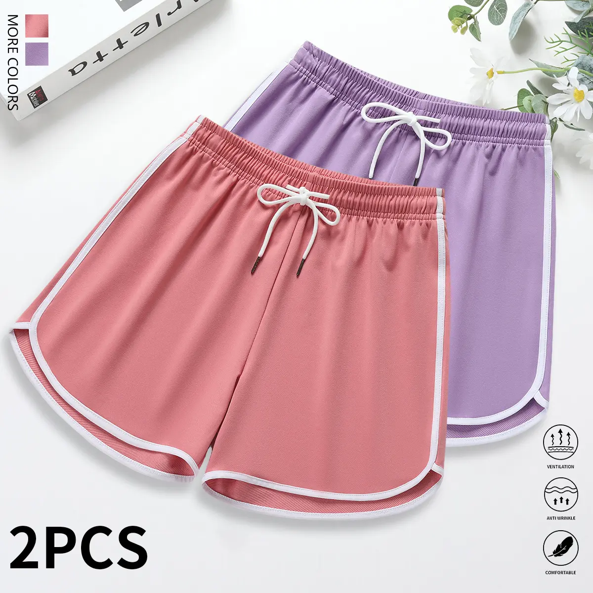 Pack of 2 women’s shorts: casual shorts, athletic shorts, lounge shorts; solid color; drawstring elastic waistband; suitable for casual wear, outdoor sports, and yoga; women’s shorts; summer clothing.