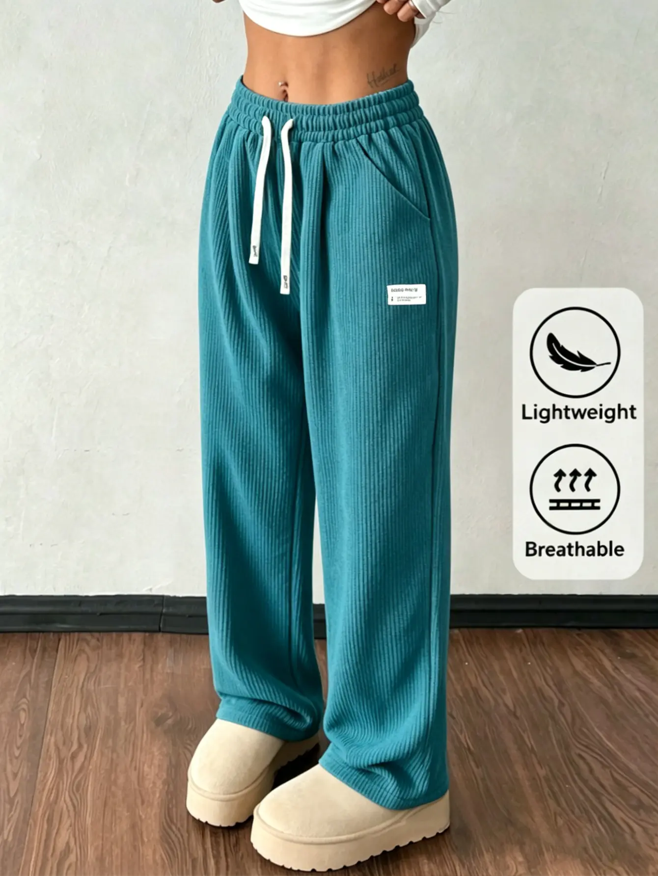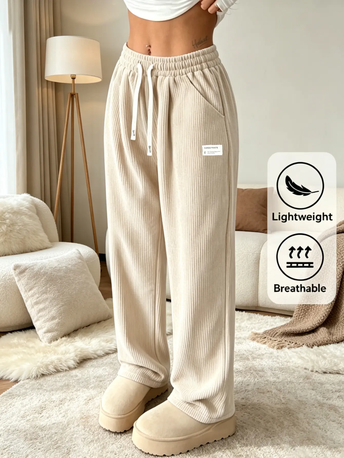 From a design perspective, the pants feature a high-waist cut combined with a wide-leg silhouette. The high waist lifts the waistline upward, naturally concealing excess fat around the waist and abdomen. Women with a slight tummy or wider waist can enjoy comfortable wear while optimizing their body proportions—visually elongating the legs to create an elegant, tall look. The overall wide-leg design provides ample room for the legs during walking, bending, stepping, and other everyday movements, avoiding any tightness. It also subtly shapes the leg lines, minimizing issues like thick legs or non-straight leg shape, making the legs appear slimmer and more straight. This style is suitable for women with pear and apple body types. The waist area features a combination design with an elastic waistband and drawstring; the elasticity of the elastic waistband has been precisely tuned—the tension is moderate with good stretch—to comfortably fit different waist sizes. The drawstring allows for free adjustment of tightness according to personal wear preferences, further enhancing the waist’s fit and stability. During everyday wear, there’s no need to worry about the waistband slipping down. The detailed design reflects human-centric considerations.