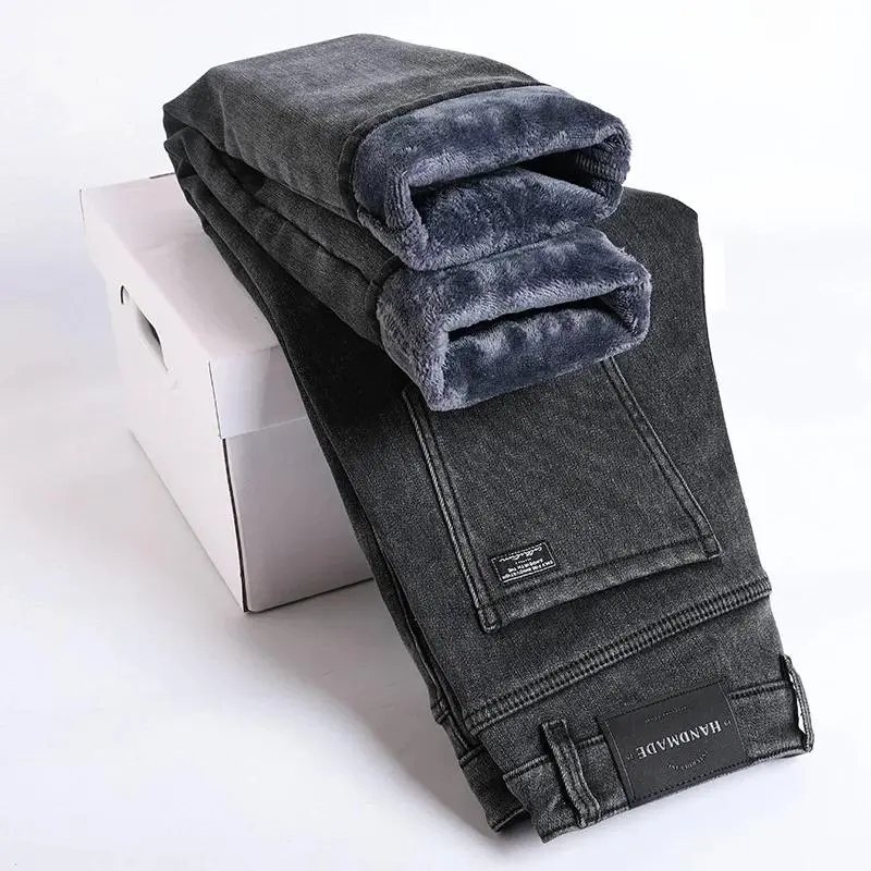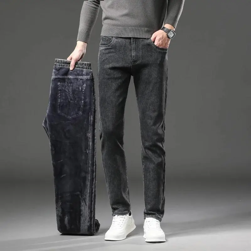 Winter Fleece Thick Warm Jeans Men's Slim Straight Elastic Denim Pants Casual Male Clothing Fashion Plush Trousers