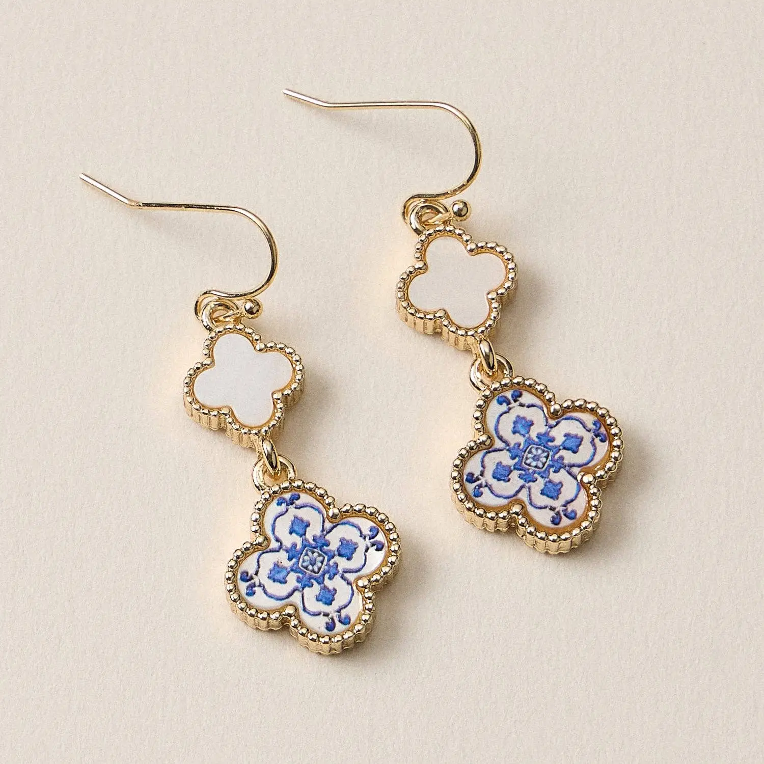 These elegant drop earrings feature a double clover design with intricate blue enamel detailing and gold trim. Lightweight yet eye-catching, they are ideal for boutiques seeking standout accessories with a timeless look.