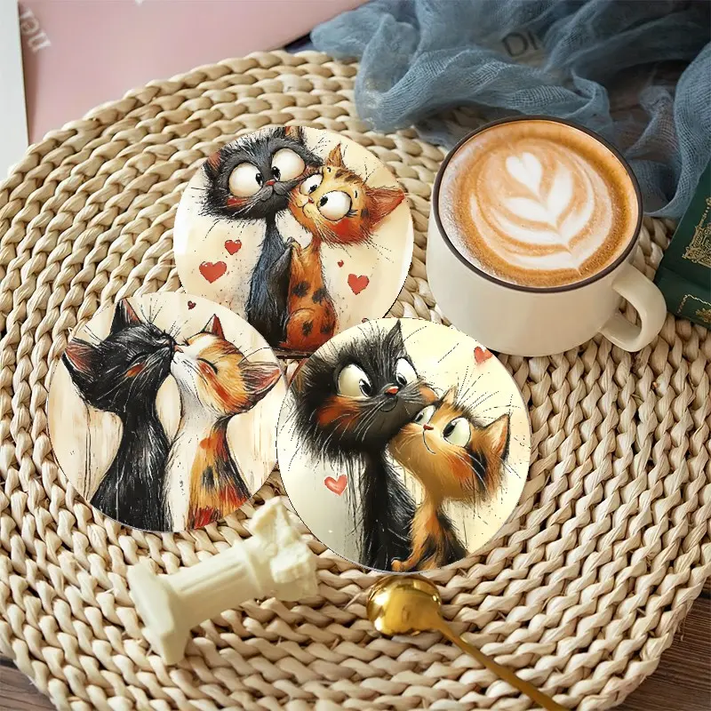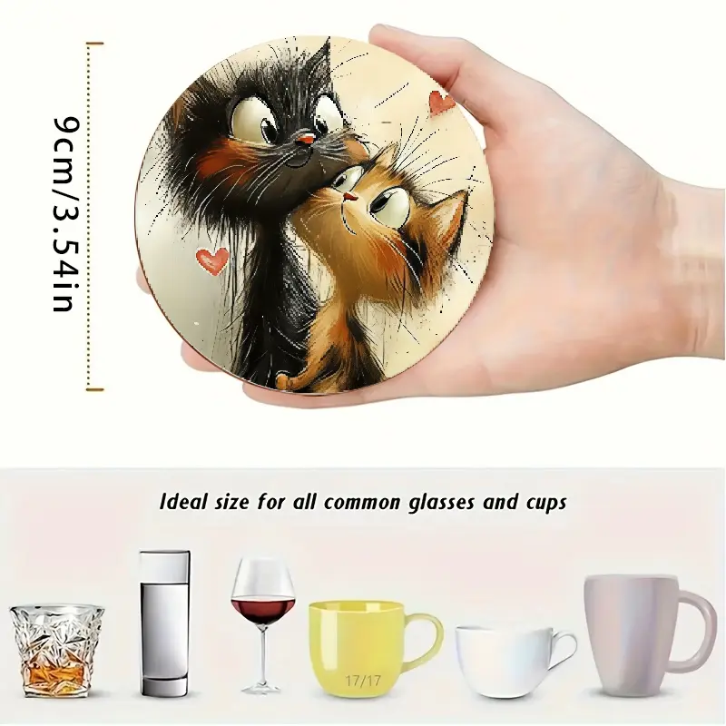☕ Cute Cat Wood Coasters Set of 6 - Aesthetic Couple Design for Coffee Lovers - Heat Insulation Pad for Kitchen Counter Tea Party - Rustic Home Decor Accessories
