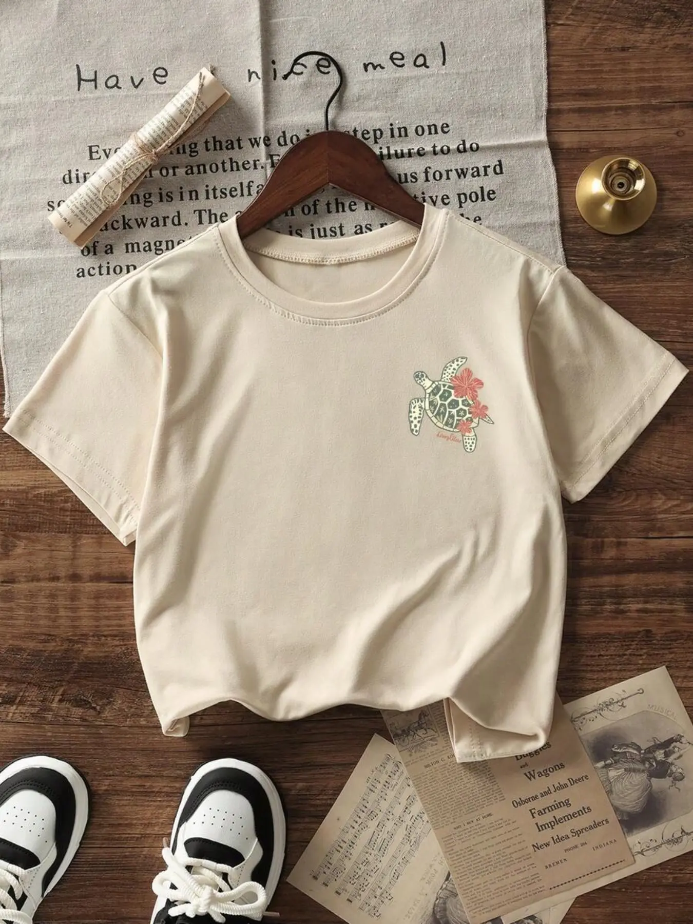 Women's Oversized Sea Turtle Floral Graphic T-Shirt, Back Print Hibiscus Flower, Casual Loose-Fit Short Sleeve Crew Neck Top