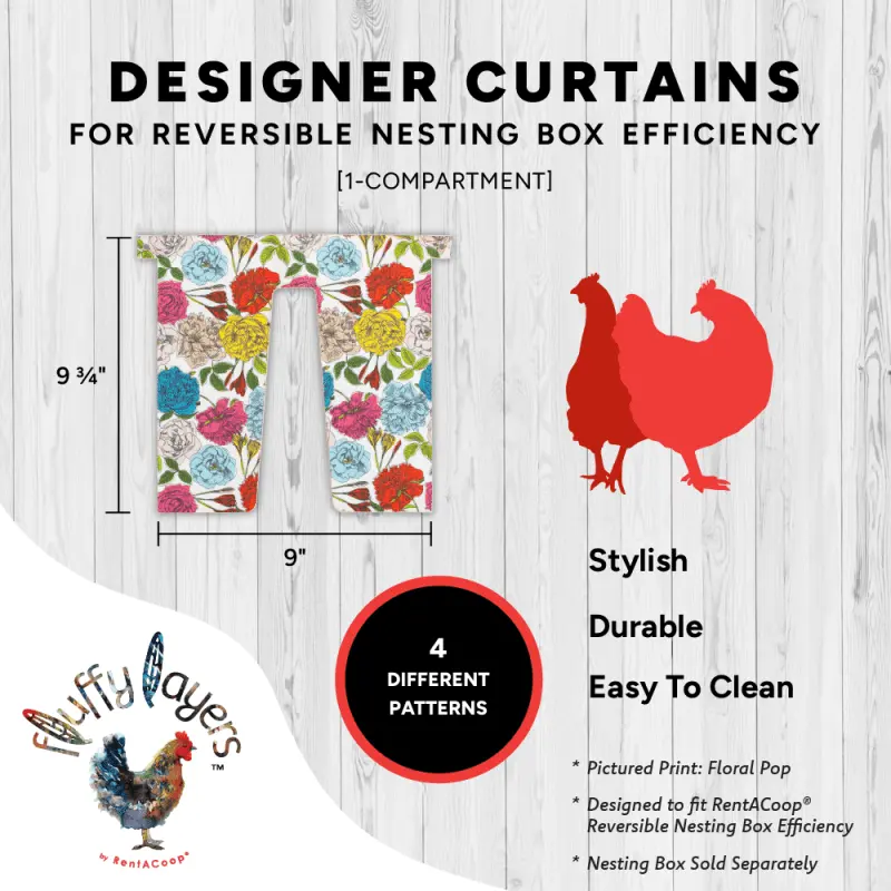 Why you'll love it! Choose one of four all new designs from Fluffy Layers by RentACoop to match your flock's aesthetic - bright, classic, elegant, or neutral; creates a private space for hens to encourage natural nesting behavior