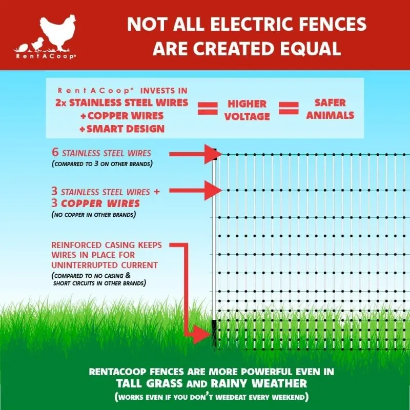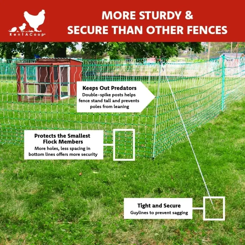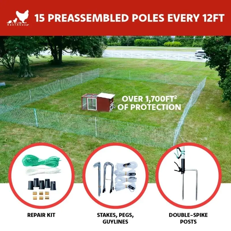 ·Over 1700 Square Feet of Protection: 168' long, pre-fastened Fiber-Reinforced Plastic Posts placed every 12 feet; triple-braided stainless steel wire. Suitable for chicks as young as 4 weeks through adult poultry, and other animals.