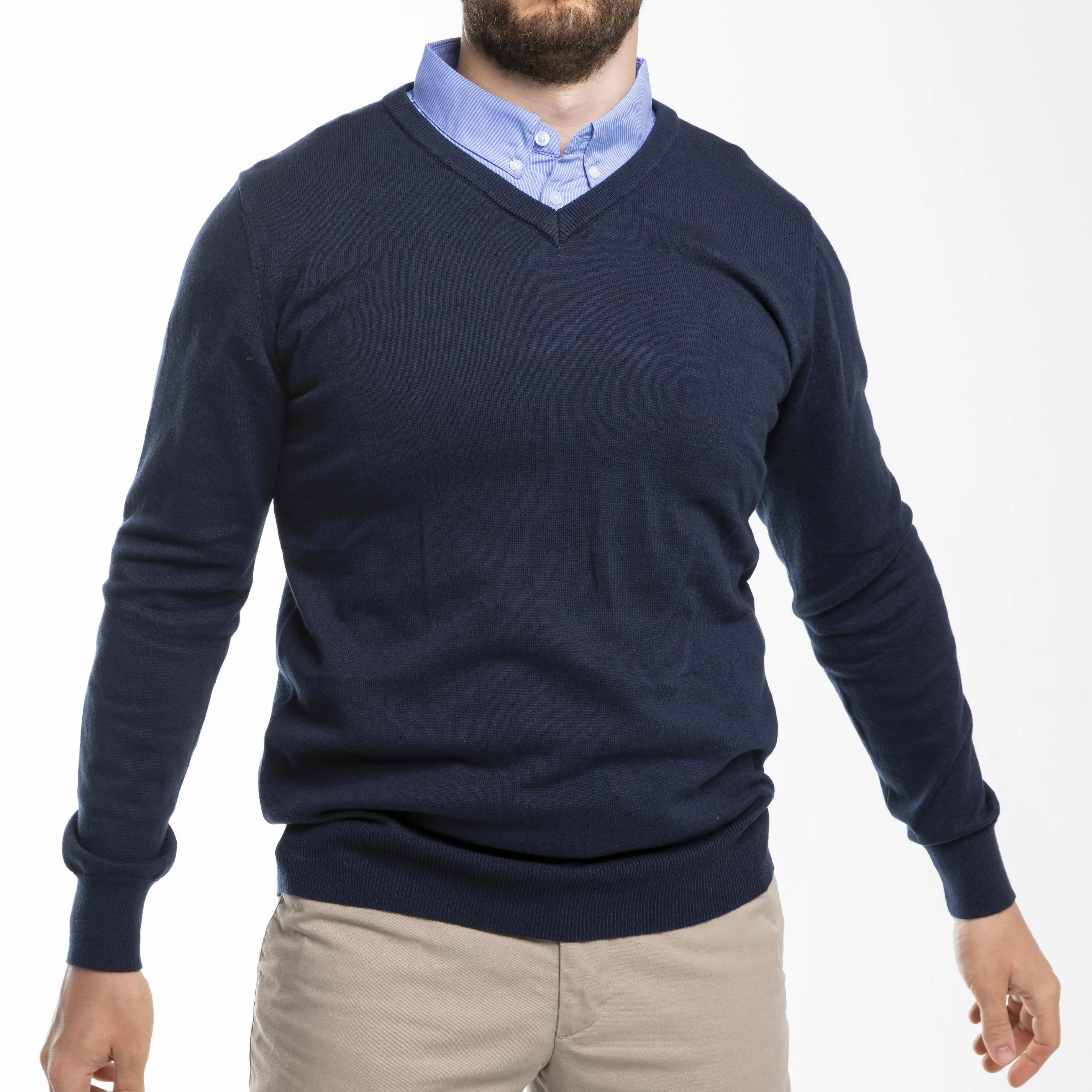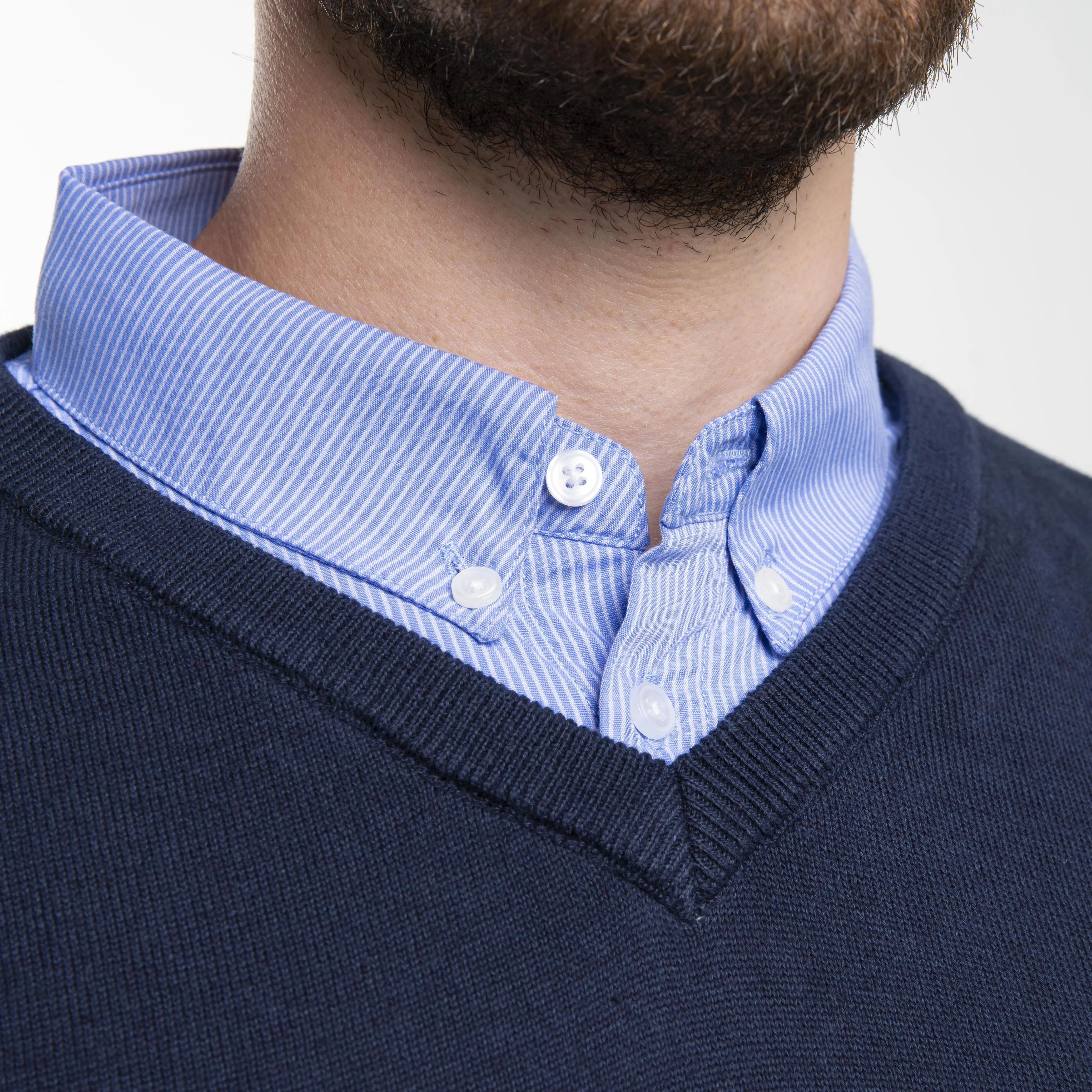 Our high quality, 100% cotton sweater in sapphire has the bonus of an attached, blue striped collar to give the appearance of a shirt and sweater combo with no one being the wiser.