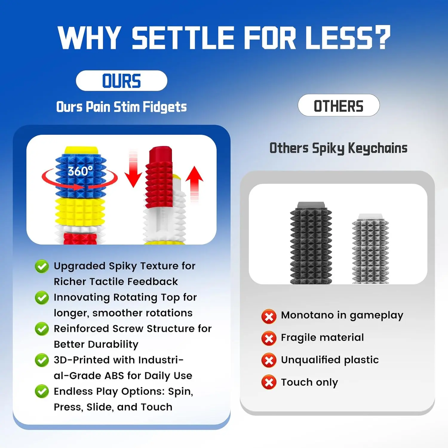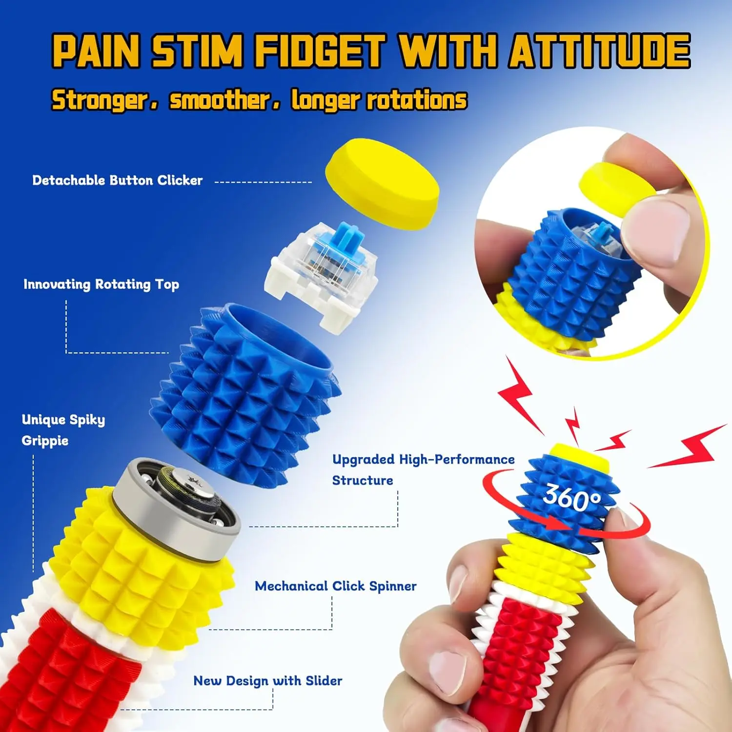 5 WAYS TO PLAY: Internally upgraded components deliver fluid, jam-free motion. Switch freely between the smooth spinner, responsive pain fidget clicker, mechanical click spinner, upgraded slider, and deep texture fidget grip based on your task or sensory preference to maintain engagement and avoid mental fatigue