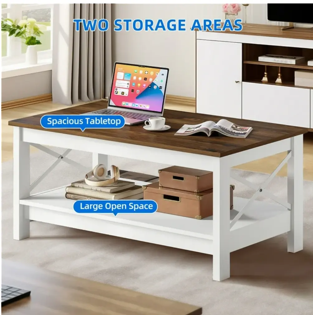 Farmhouse 2-Tier Rectangular Wood Coffee Table, Brown/White