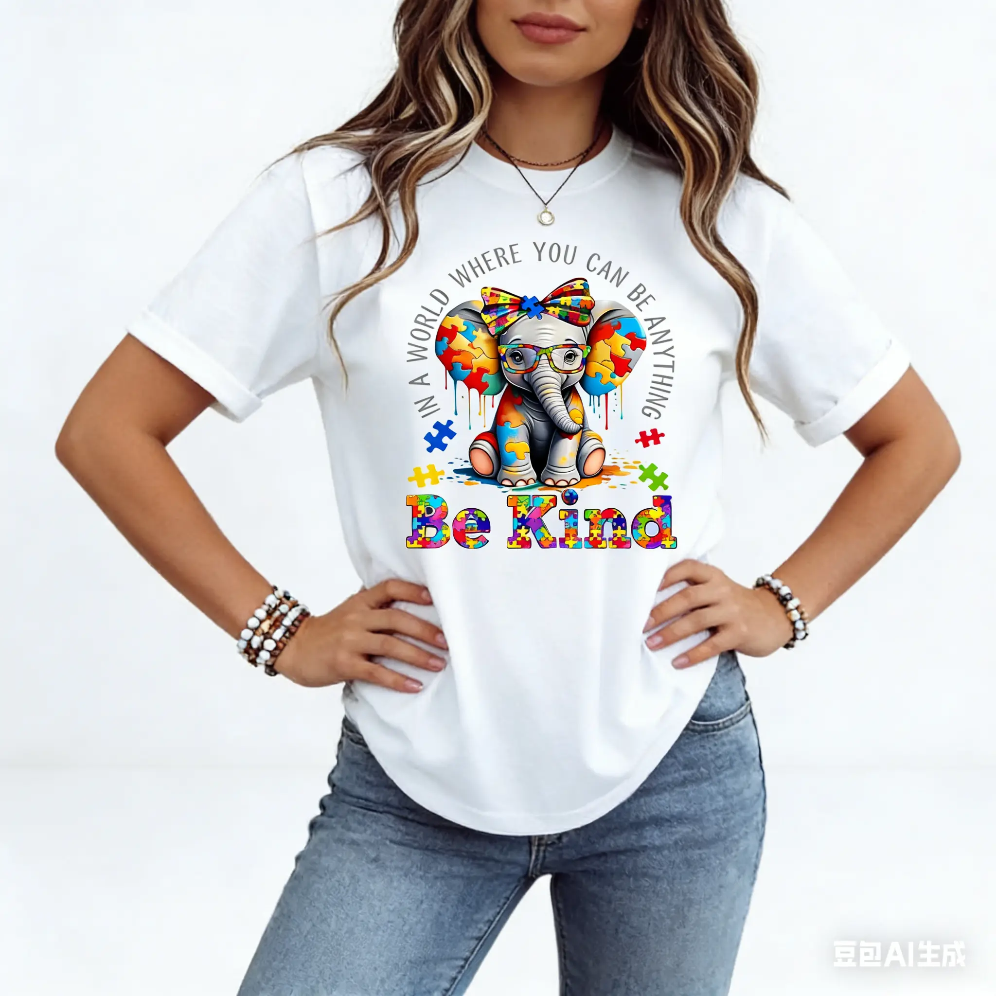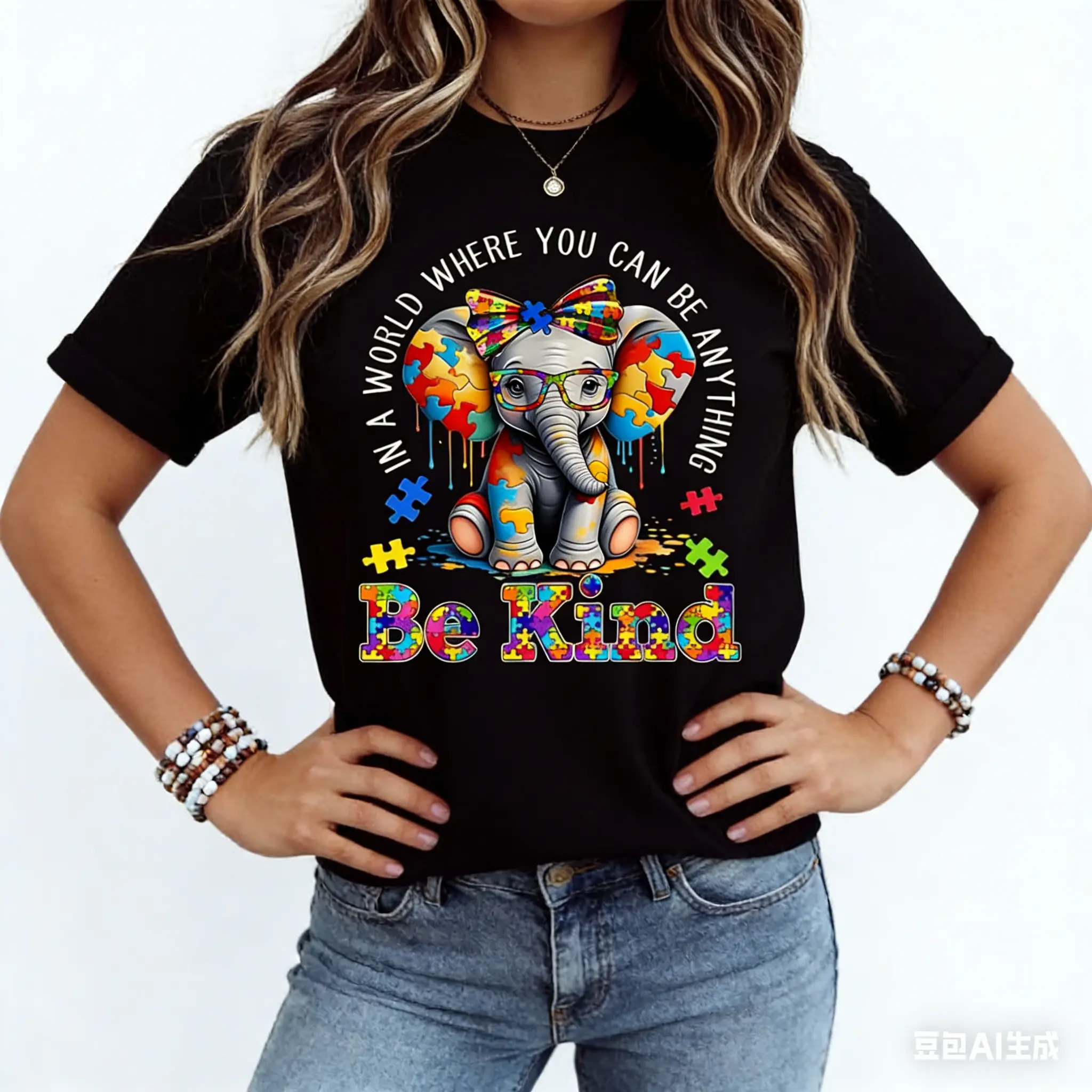 Elephant With Puzzle Pieces And Be Kind Print T Shirt Crew Neck Casual Wear For Women And Girls