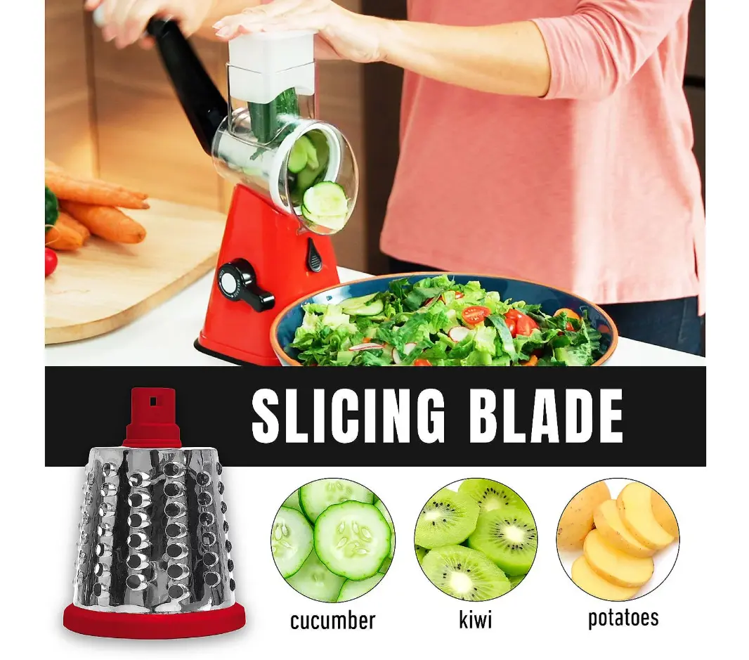 SUSTEAS Rotary Food Cheese Grater with Handle, 5 Blades and Strong Suction Cup Base, Comes with 1 Blade Storage Box Kitchen Utensils Red Durable Vegetable Slicer Vegetable Cutting Slicer Vegetable Cutter