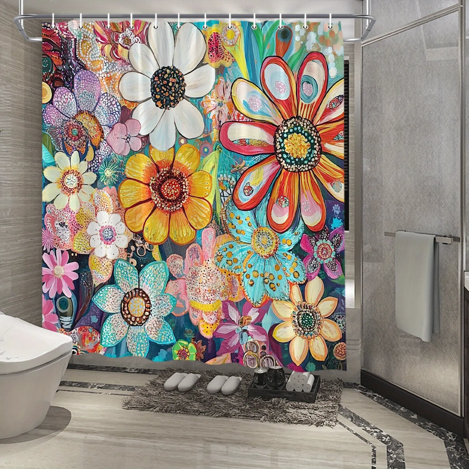 Transform your bathroom with this vibrant Boho Shower Curtain. Featuring a dazzling floral design of daisies and eucalyptus leaves, it brings a touch of nature indoors. Perfect for country-style decor, this polyester fabric curtain measures 70x70 inches. It includes 12 hooks for easy installation. Ideal for home decorators looking to add a splash of color and charm to their bathroom.