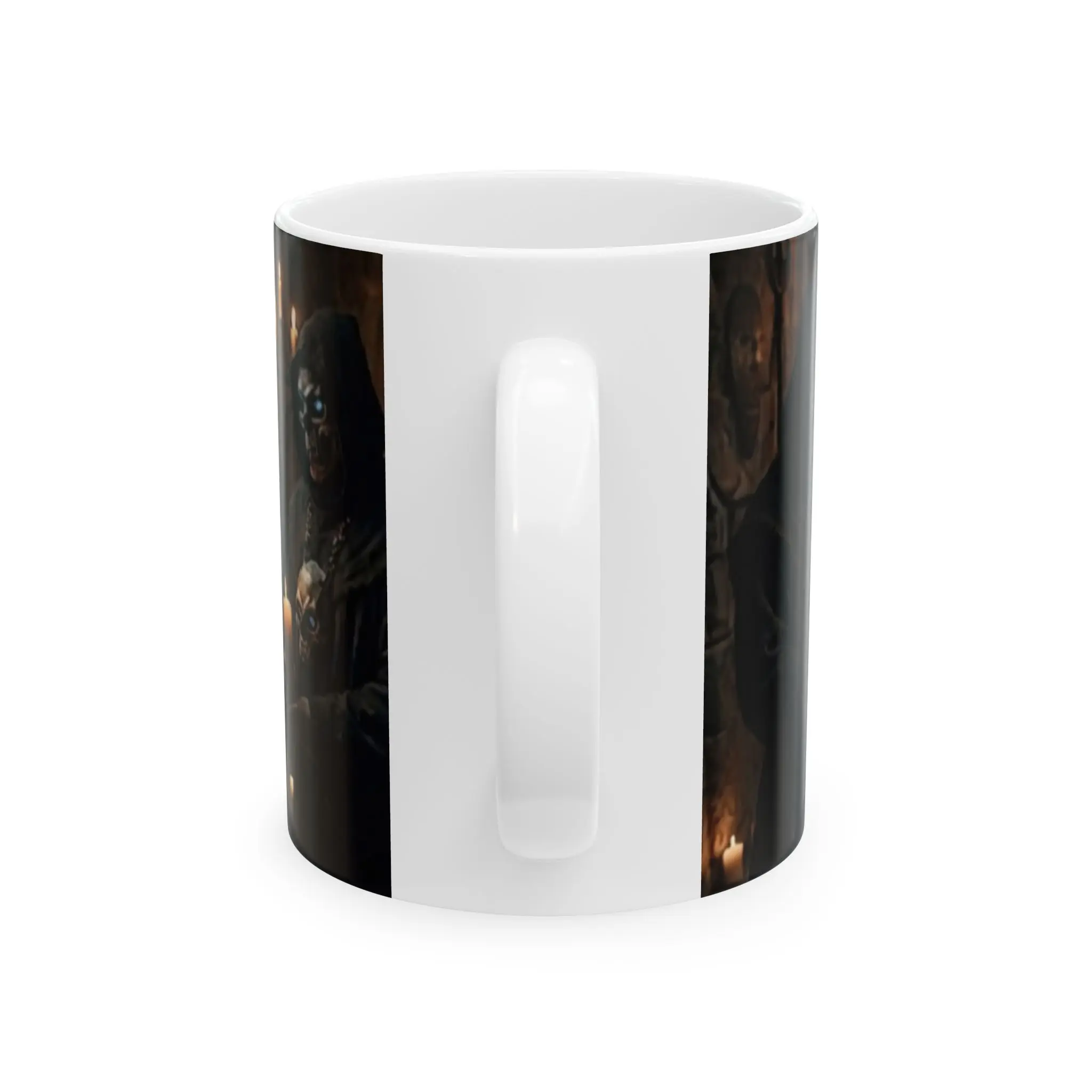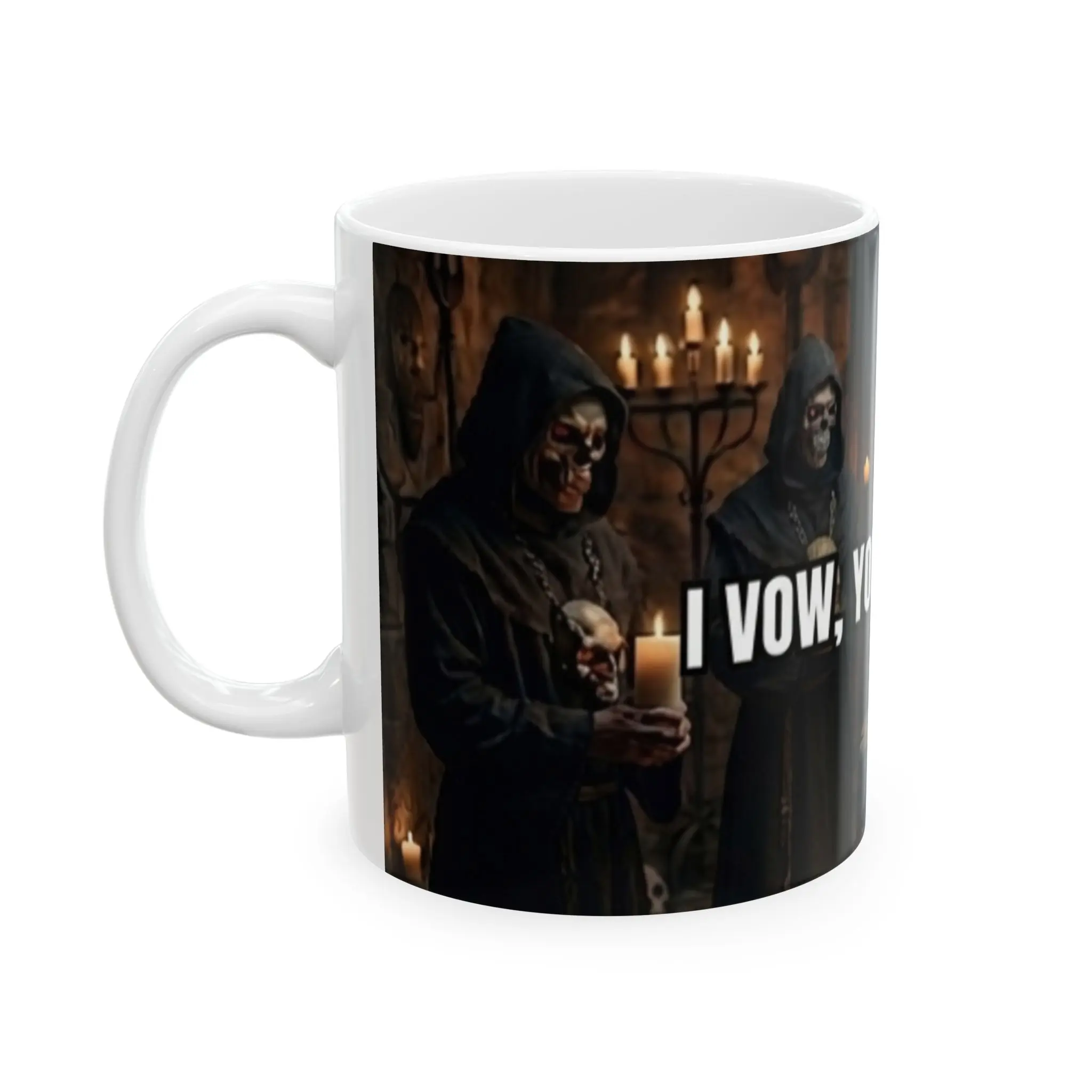 This glossy ceramic mug brings a touch of shadowed ceremony to your morning routine. The wraparound print shows hooded figures in a dim, candlelit hall—an image that feels like a scene from a low-lit fantasy tavern or secret order. Bold, white text crosses the scene, lending a slightly irreverent, chant-like energy that sparks conversation. Hold it in your hands while you plan a campaign, write late-night notes, or savor a quiet, moody coffee break. The bright, high-resolution print contrasts with the deep, atmospheric background so the design stays striking cup after cup.