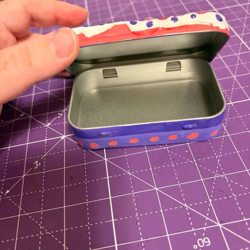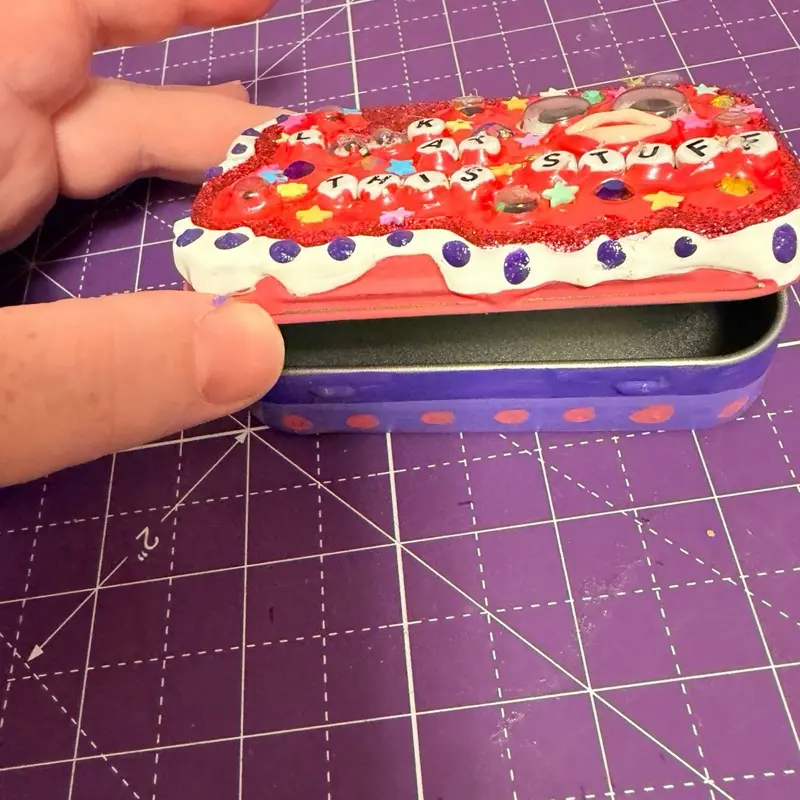 This one of a kind hand decorated trinket tin can be home for all your tiny little things! This one is decorated with beads, googly eyes, lips, gems, glitter and polka dots. It has red white and purple for its main color scheme.