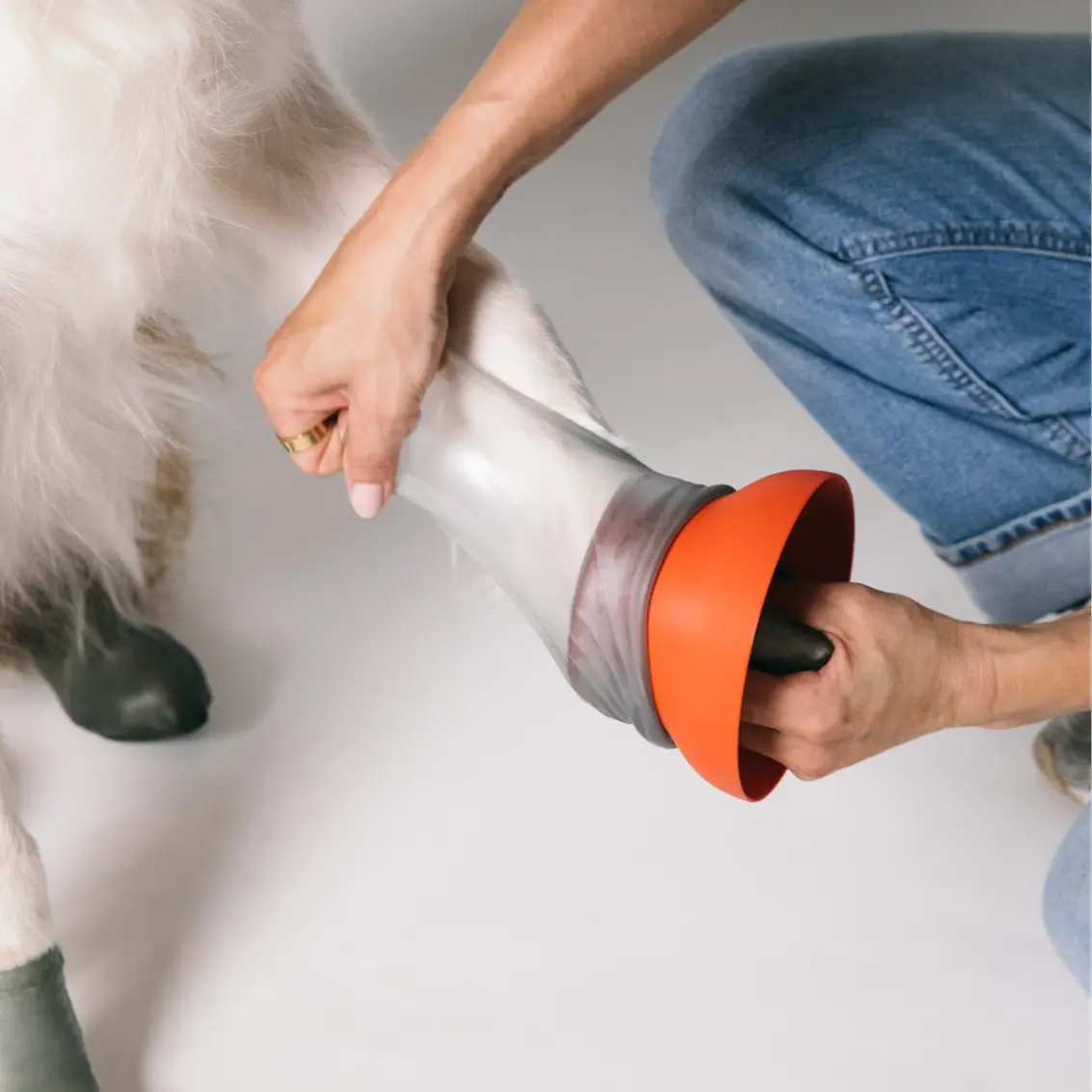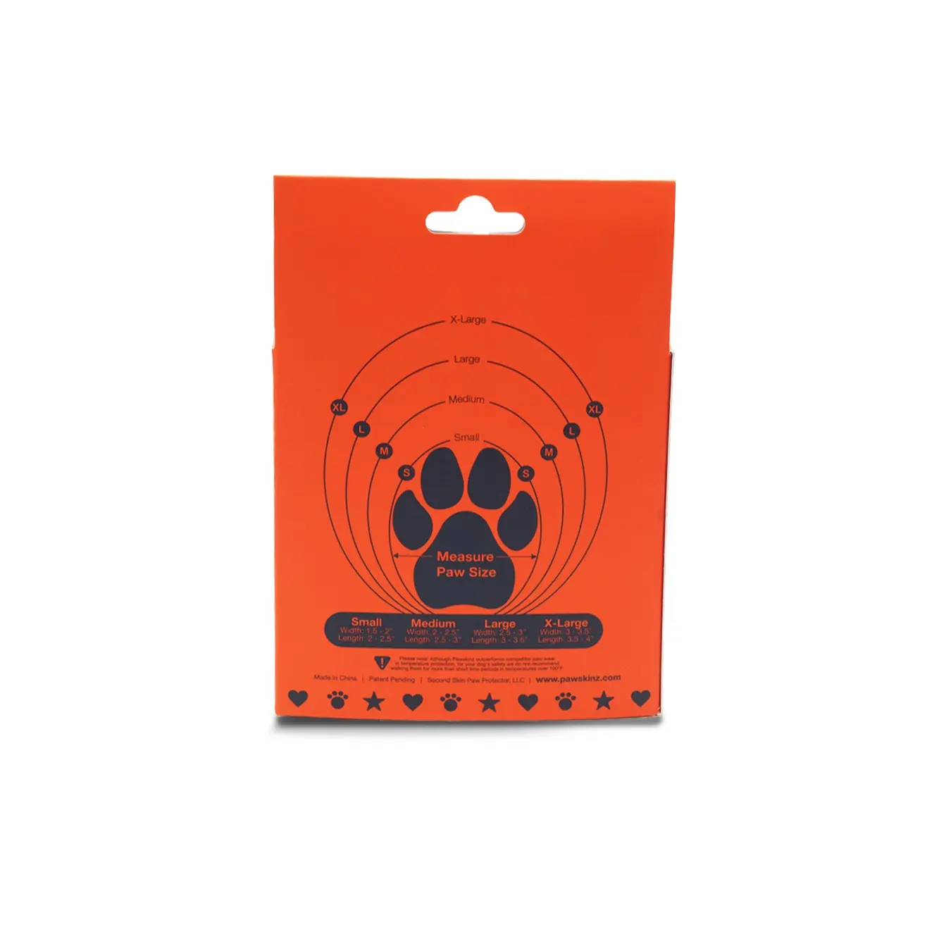 ("Easy On" applicator ring and carrying pouch included.) Patent pending, glow-in-the-dark, hybrid thermal sock and applicator ring designed to provide easy, comfortable, short-term protection and relief from environmental factors. These hybrid socks provide protection from extreme hot or cold surfaces, rough pavement, sandy terrain, and sore or injured paws. They also offer traction on hard or slippery surfaces and are chemical-proof, waterproof, biodegradable, and recyclable. Flexible and stretchy with a built-in claw garage for extra comfort. Includes 5 Pawskinz hybrid thermal socks, an applicator ring, and a carrying pouch. Extra Large Paw Size: Paw Width- 3"-3.5" x Paw Length- 3.5"-4"