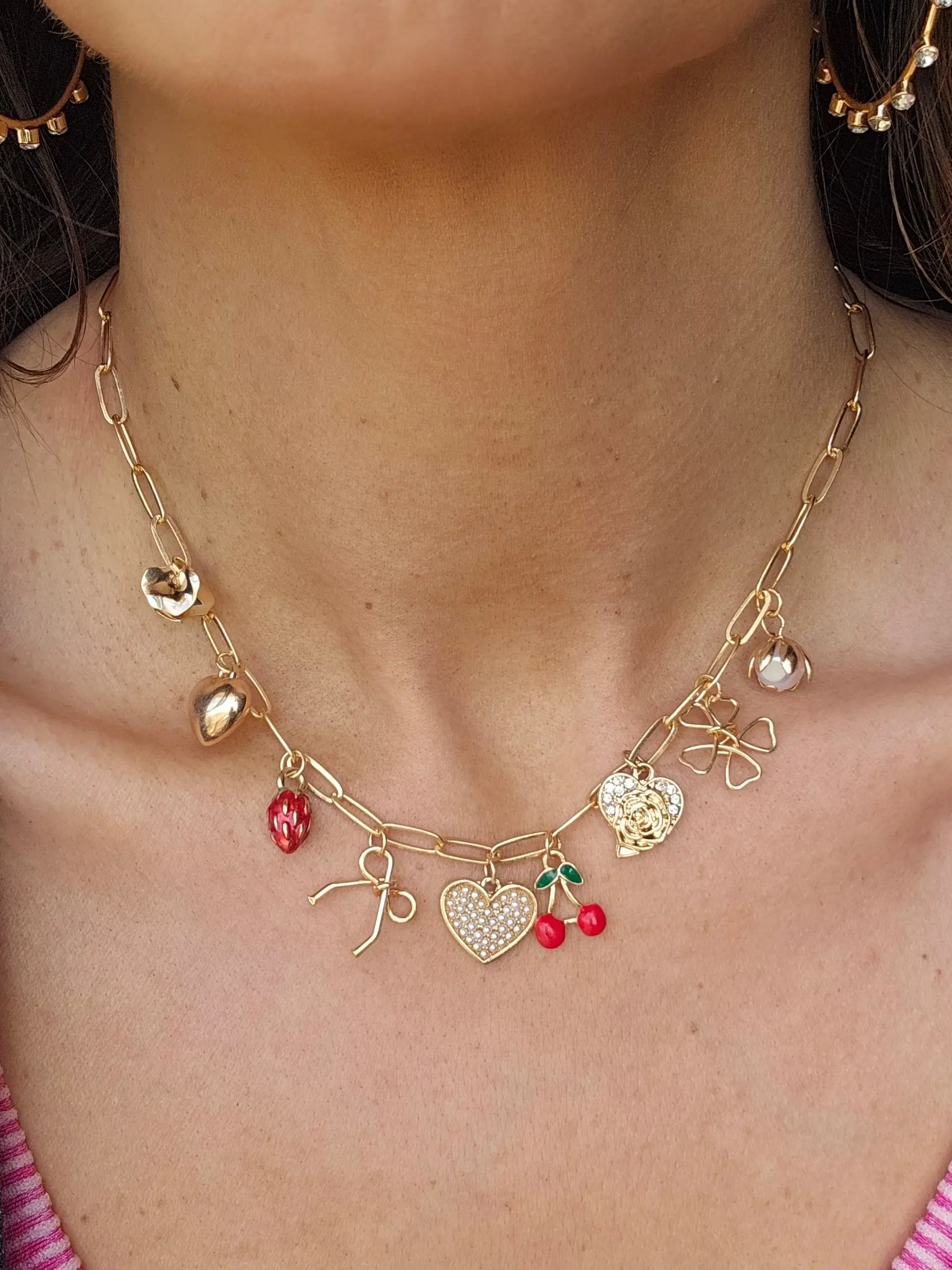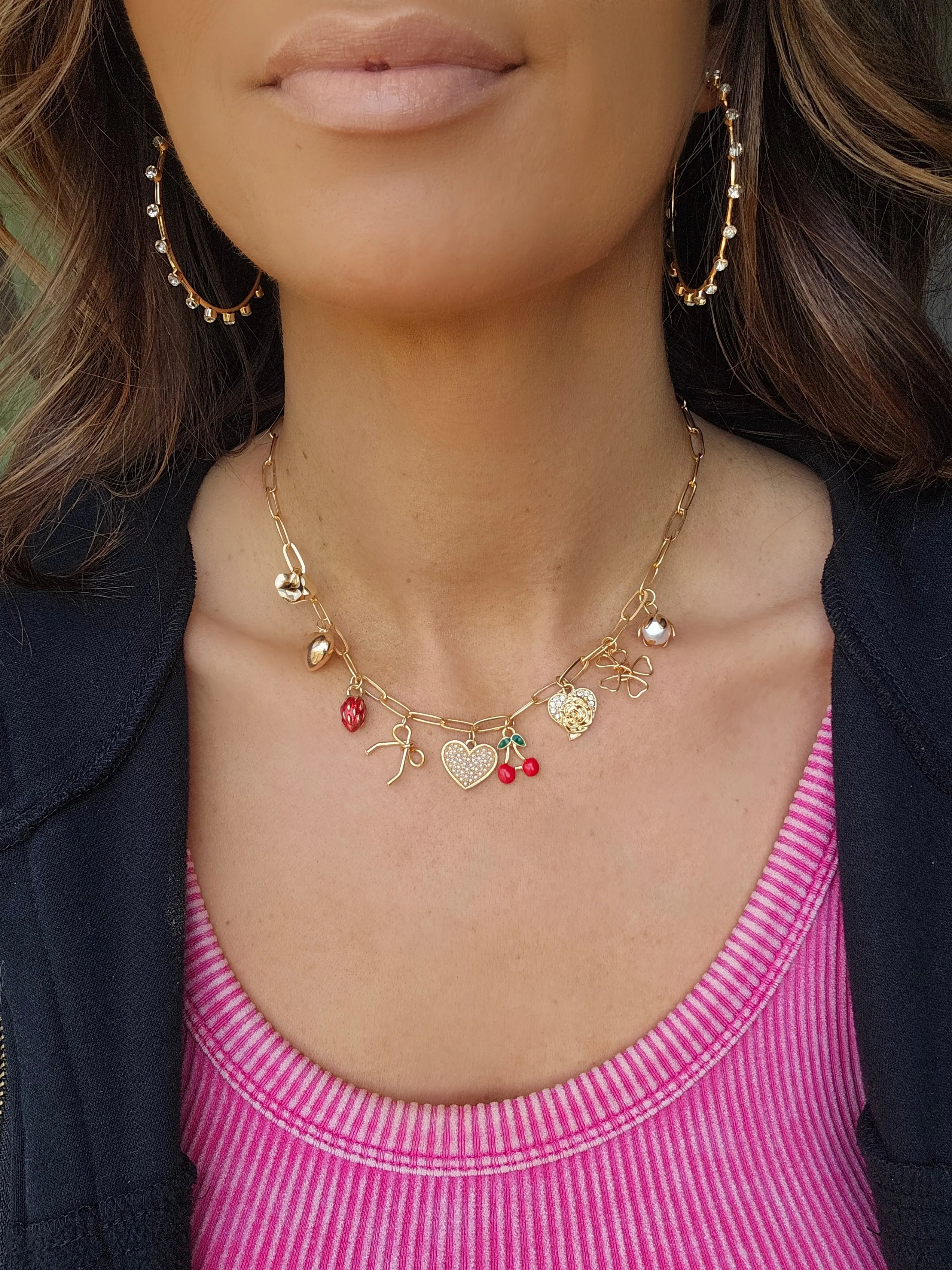 A delightful accessory that adds a whimsical touch to any outfit. This necklace features a variety of charming pendants, including bows, cherries, hearts, strawberries, and flowers, all beautifully arranged on a delicate chain. Perfect for expressing your playful style.