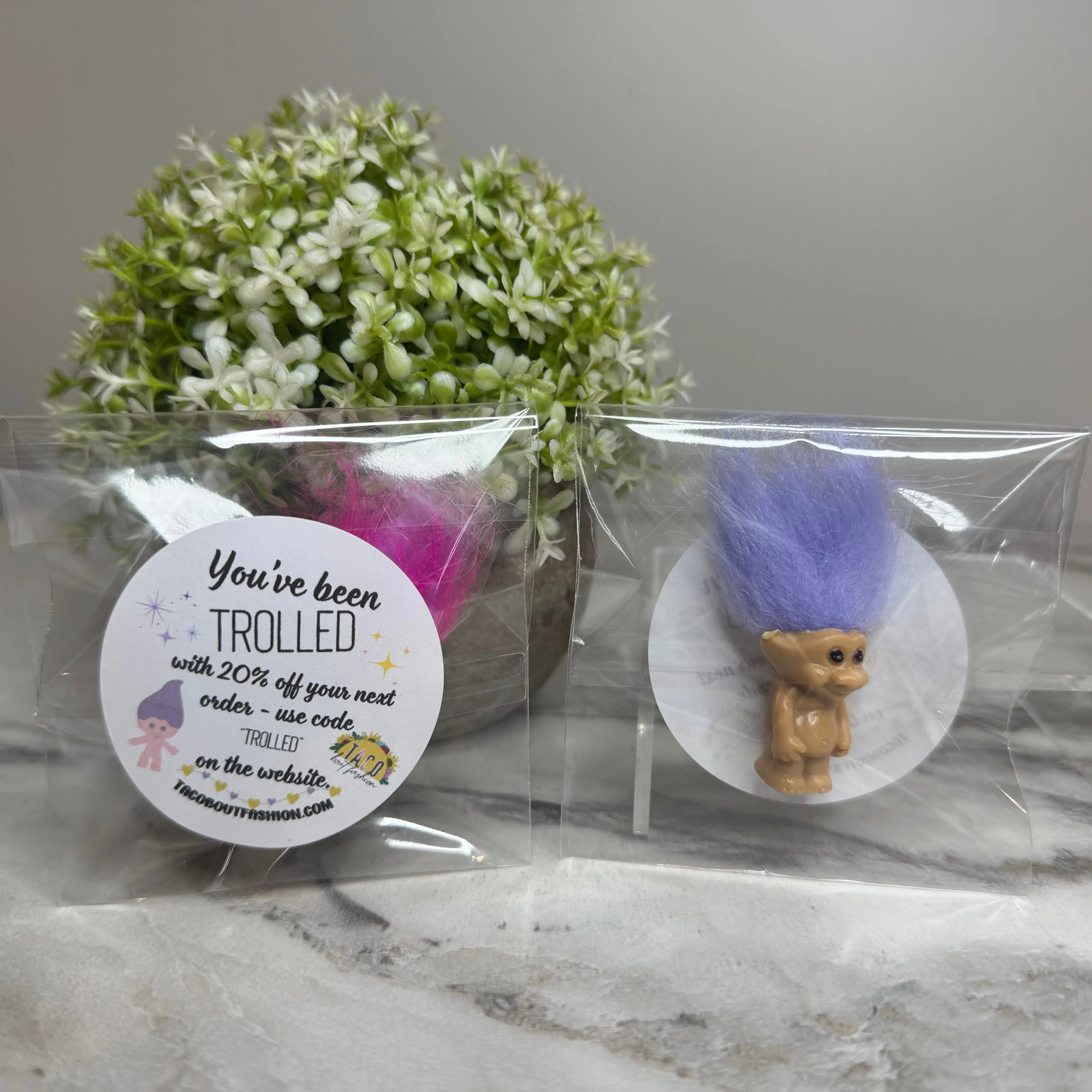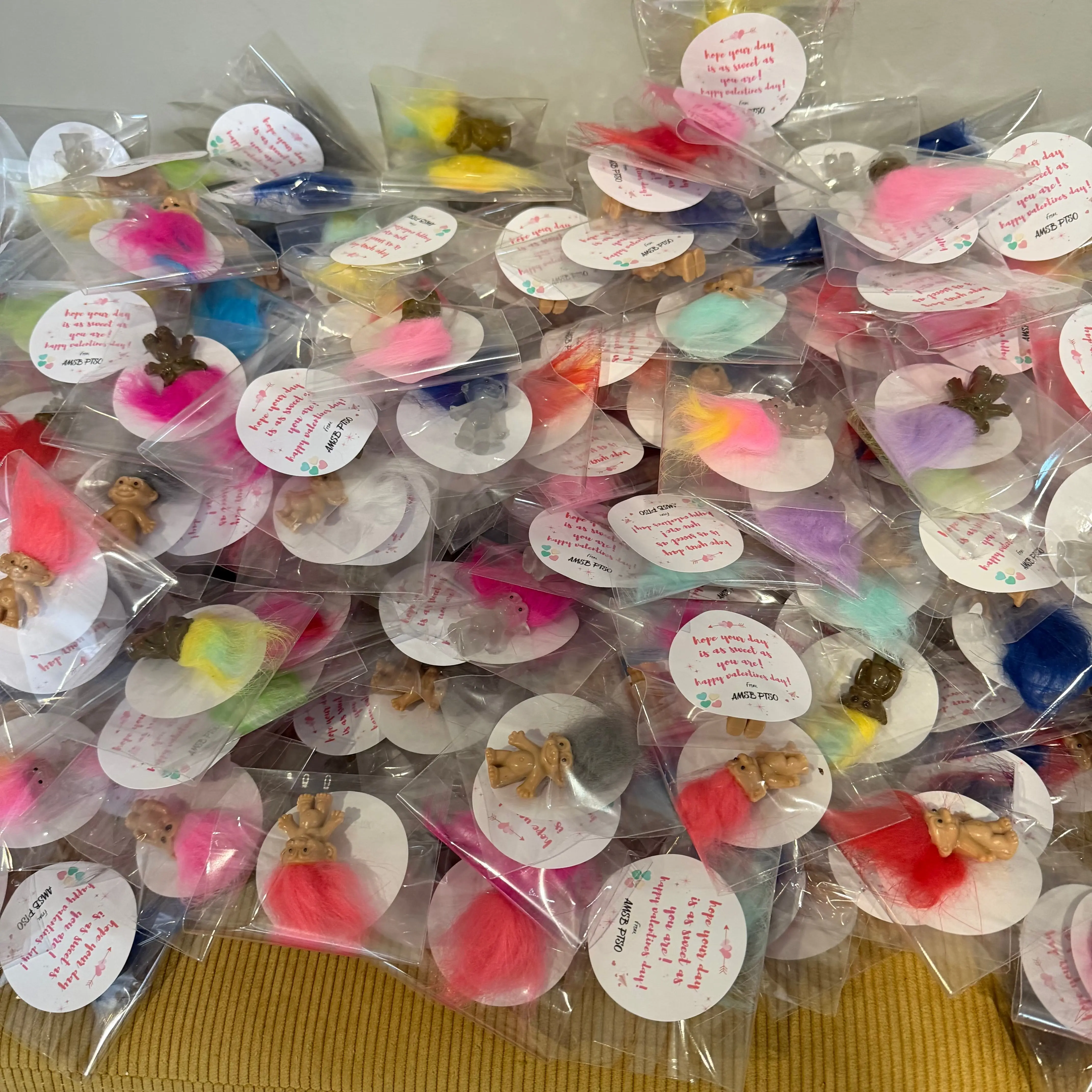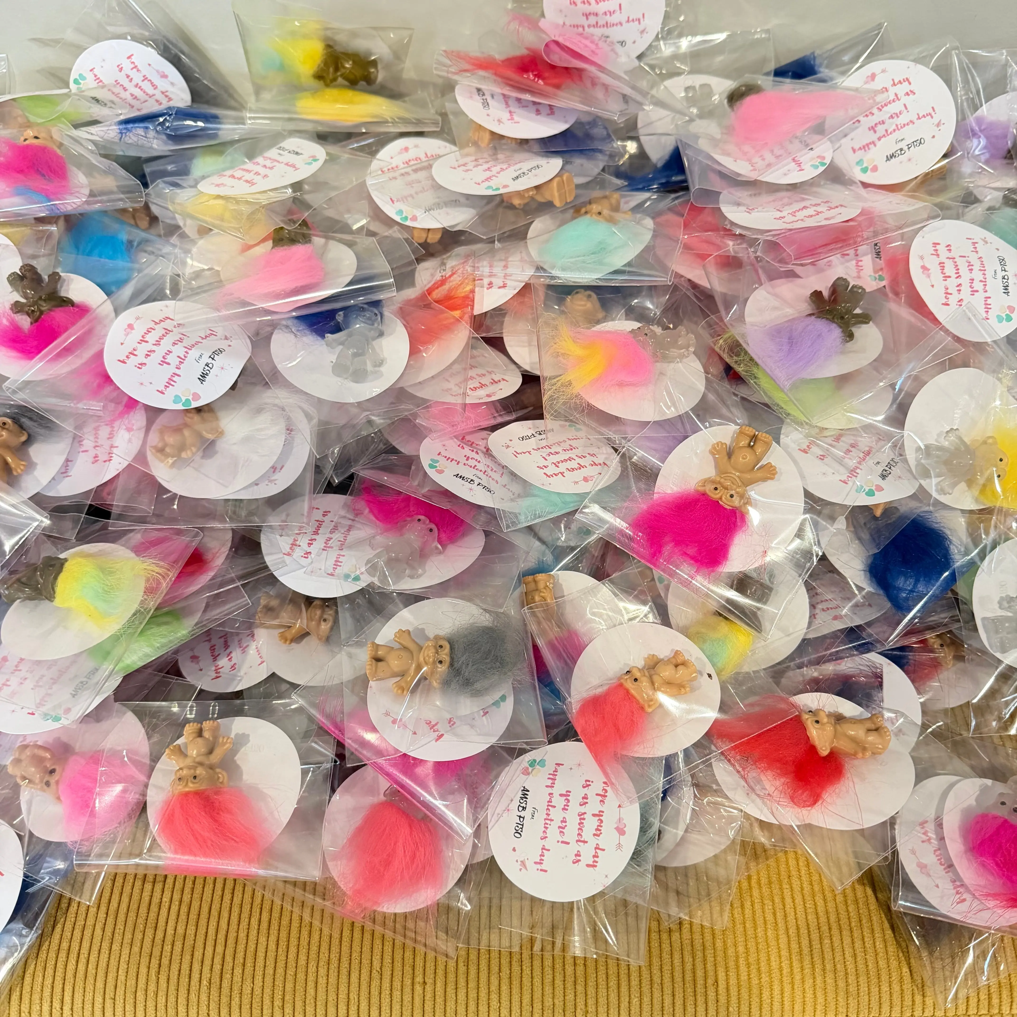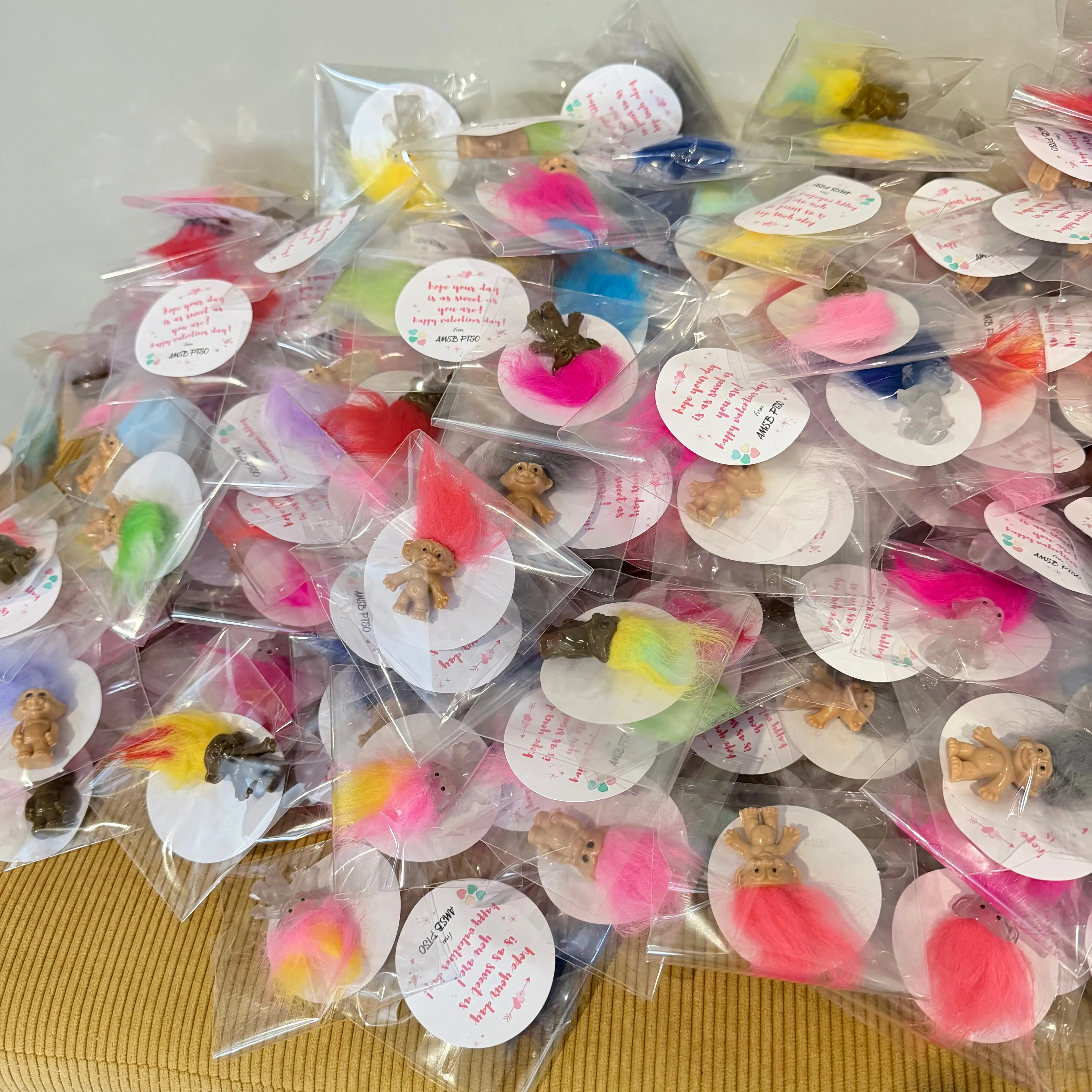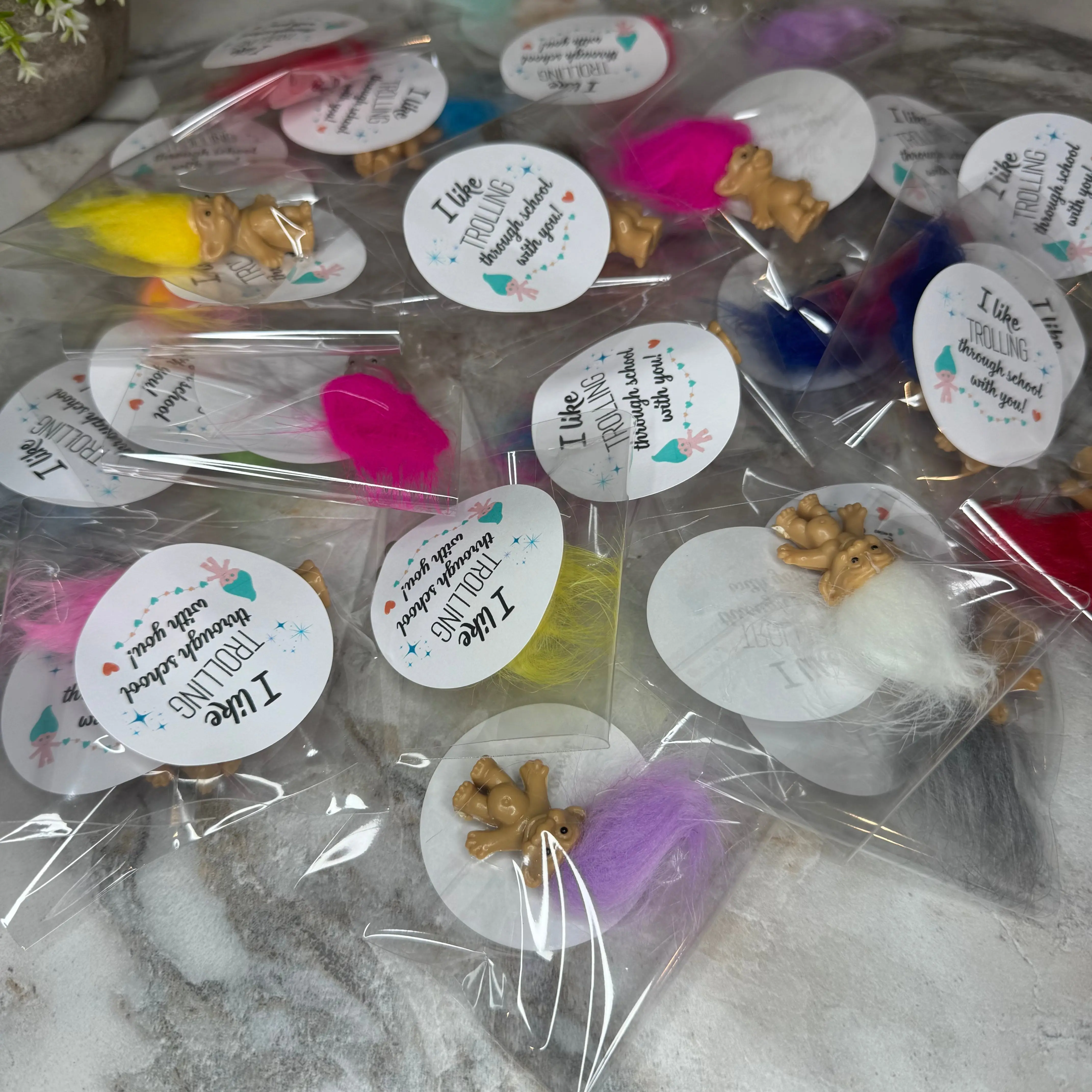 Come grab some trolls gift sets. These come individually wrapped with a sticker. Custom stickers require a 20 piece minimum.