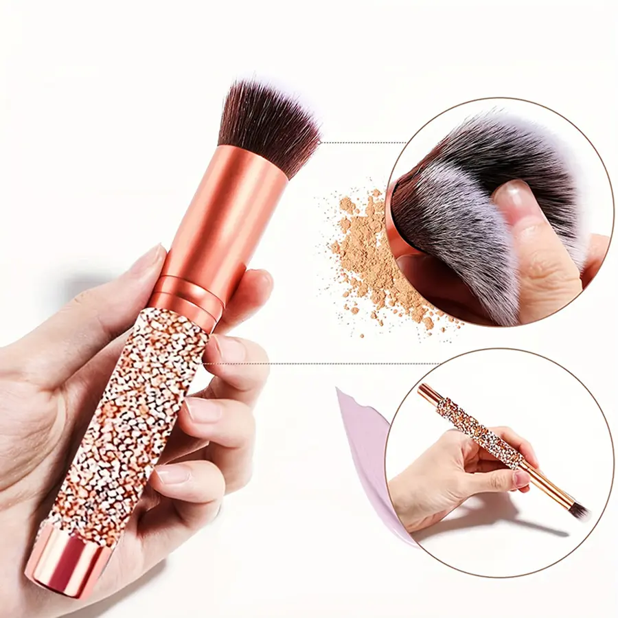The most attractive highlight of these makeup brushes is their shiny handles.It is made of plastic with mini crystals encrusted on it for an elegant look.