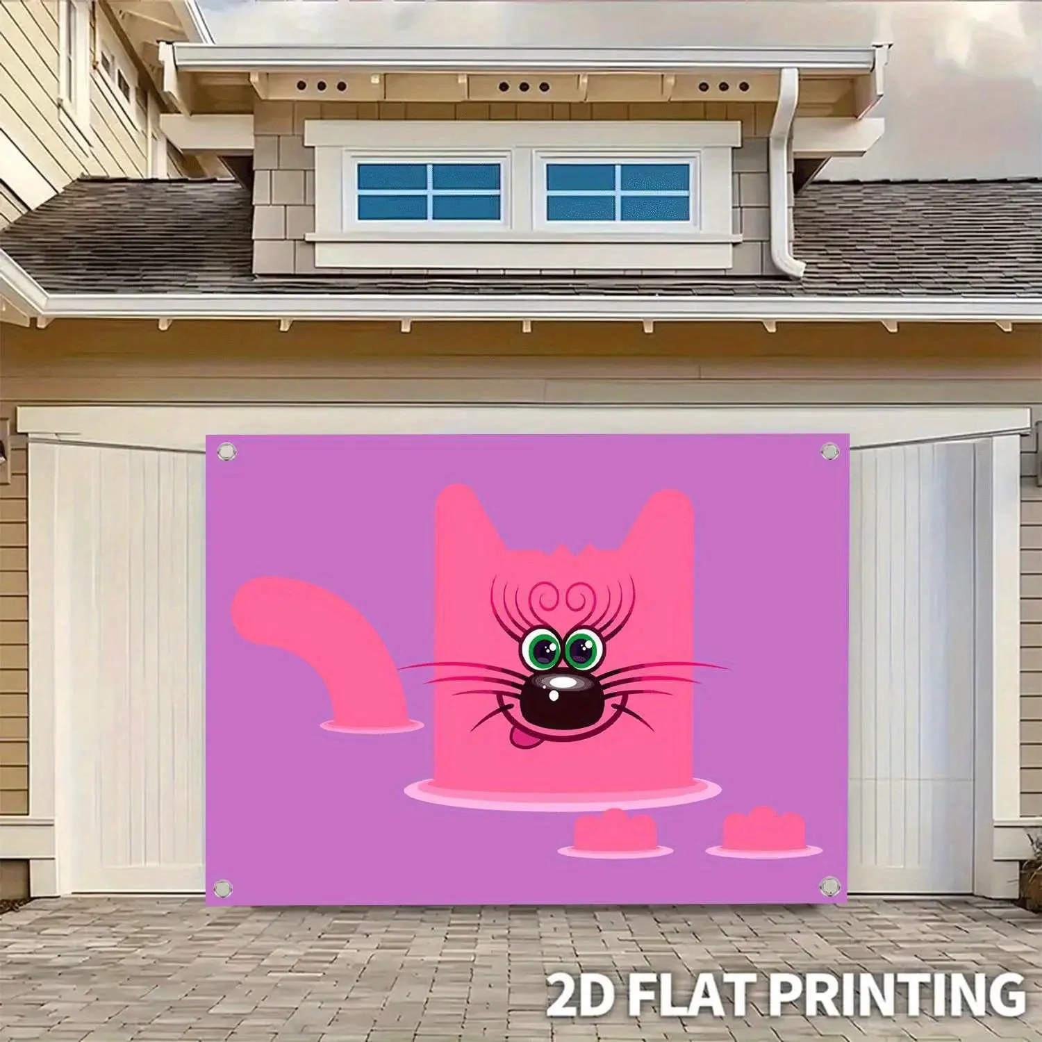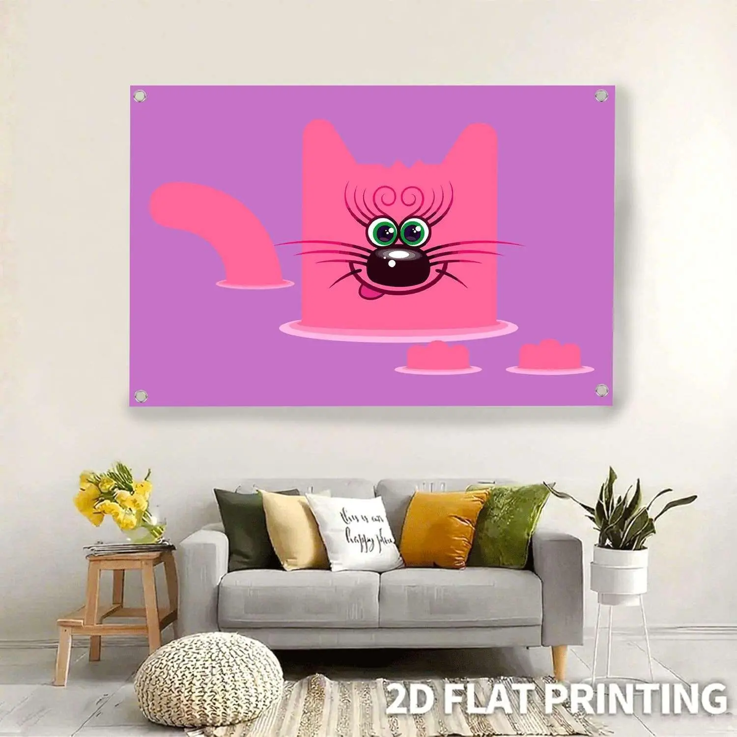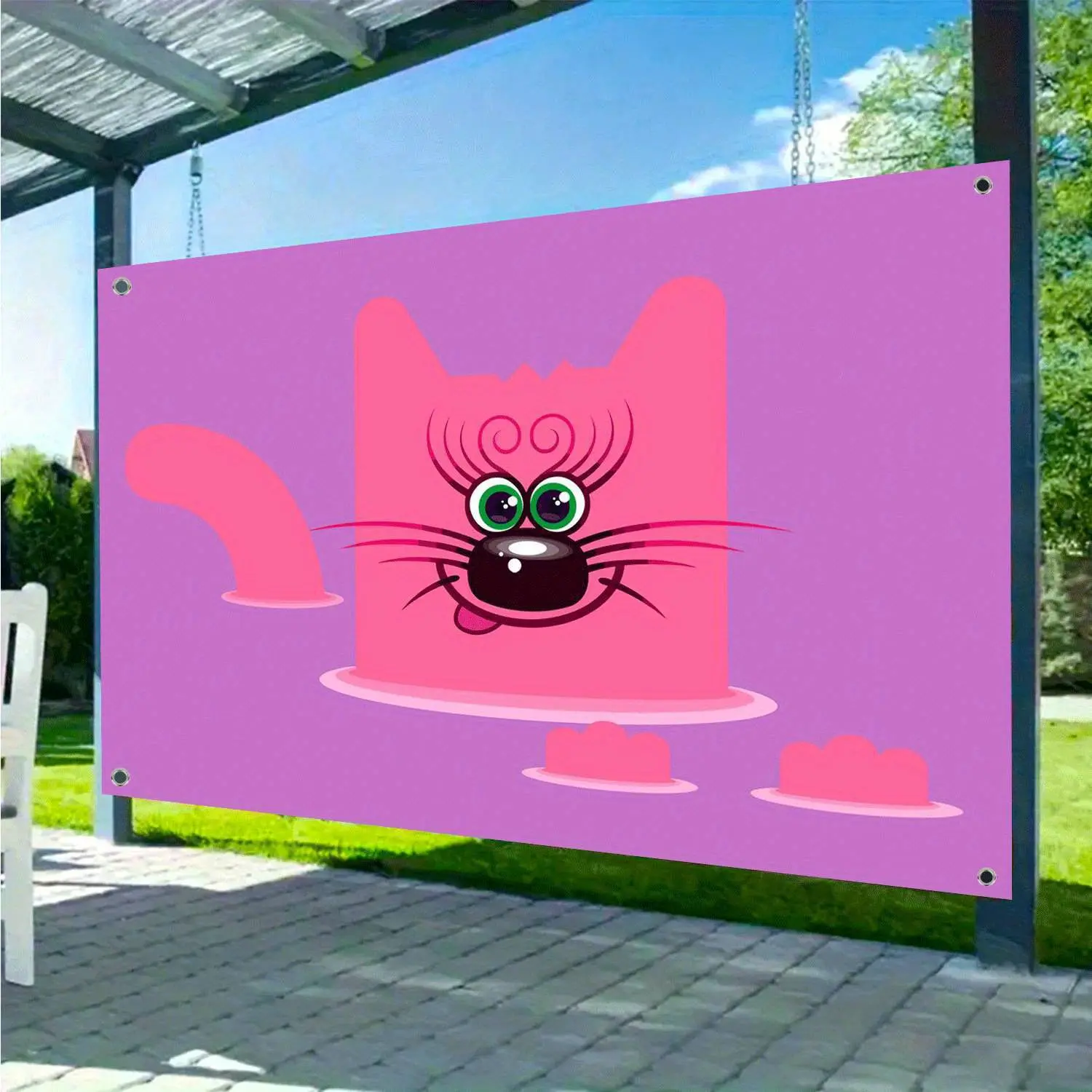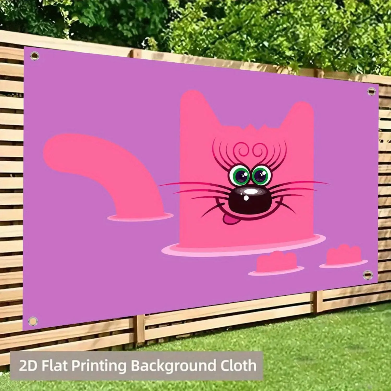 A Decorative Flag with 4 Grommets, Featuring a 2D Digital Print of a Funny Cartoon Cat Pattern. This Backdrop Is Suitable for Both Indoor And Outdoor Home Decoration, Serving As a Banner Or Wall Decor. It Comes in a Pink Cartoon Cat Style, Perfect