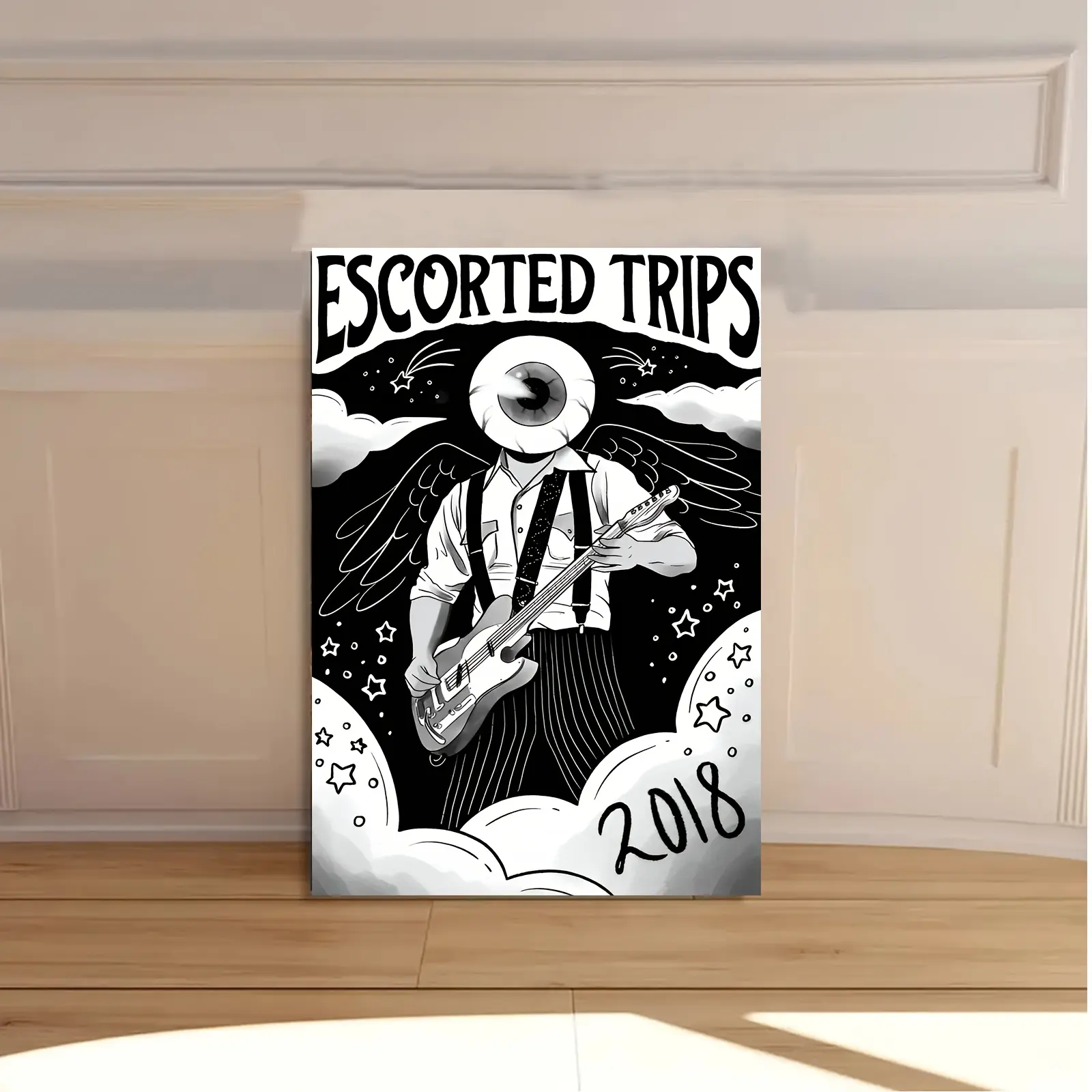 5. 1pc Frameless Black & White "Escorted Trips" Music Festival Zine Cover Wall Art - 12x18 Inch Guitar & Eyeball Character Design, Retro 2018-Themed Canvas Print for Bars, Offices, Bedrooms - Indie Music Fan Gift, Wall Banner, Stickers Muraux
