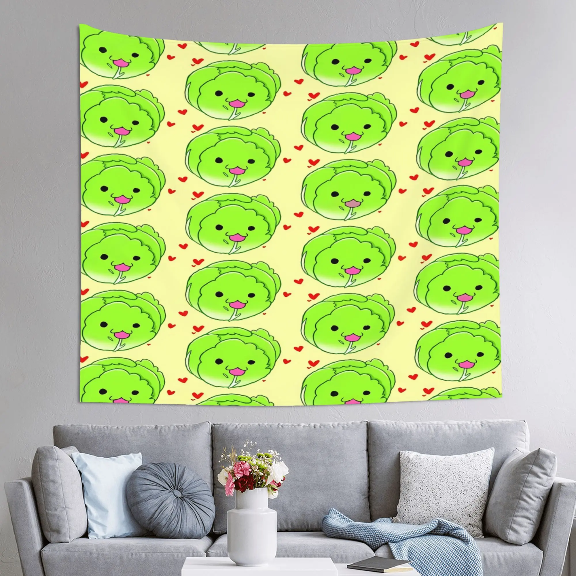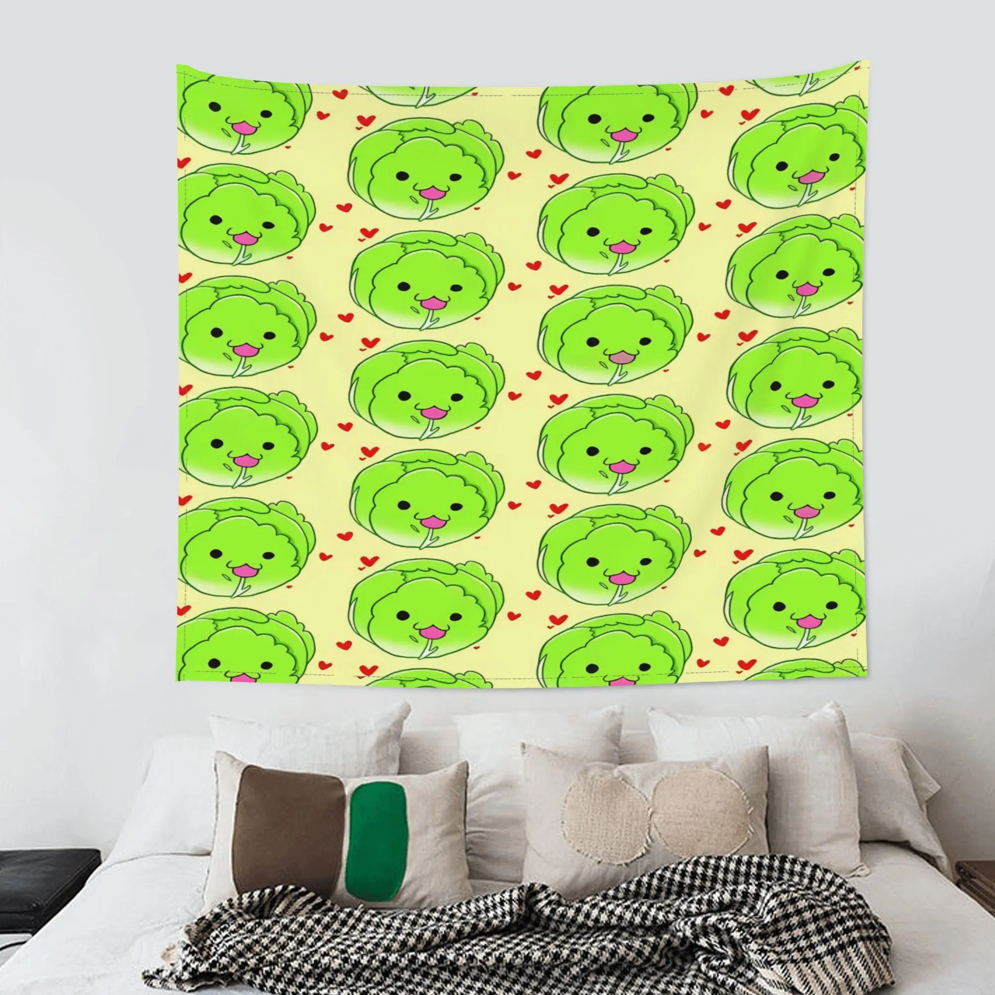 5. 2D Flat, 1pc Cute Cabbage & Cabbage Leaf Wall Hanging Tapestry - Large Green Cabbage Head Characters with Smiling Faces, Pink Hearts & Yellow Background, 51x60 Inch Horizontal Fade-Resistant Polyester Fabric Room, Party Decor, 6D Flat, Tapestries,