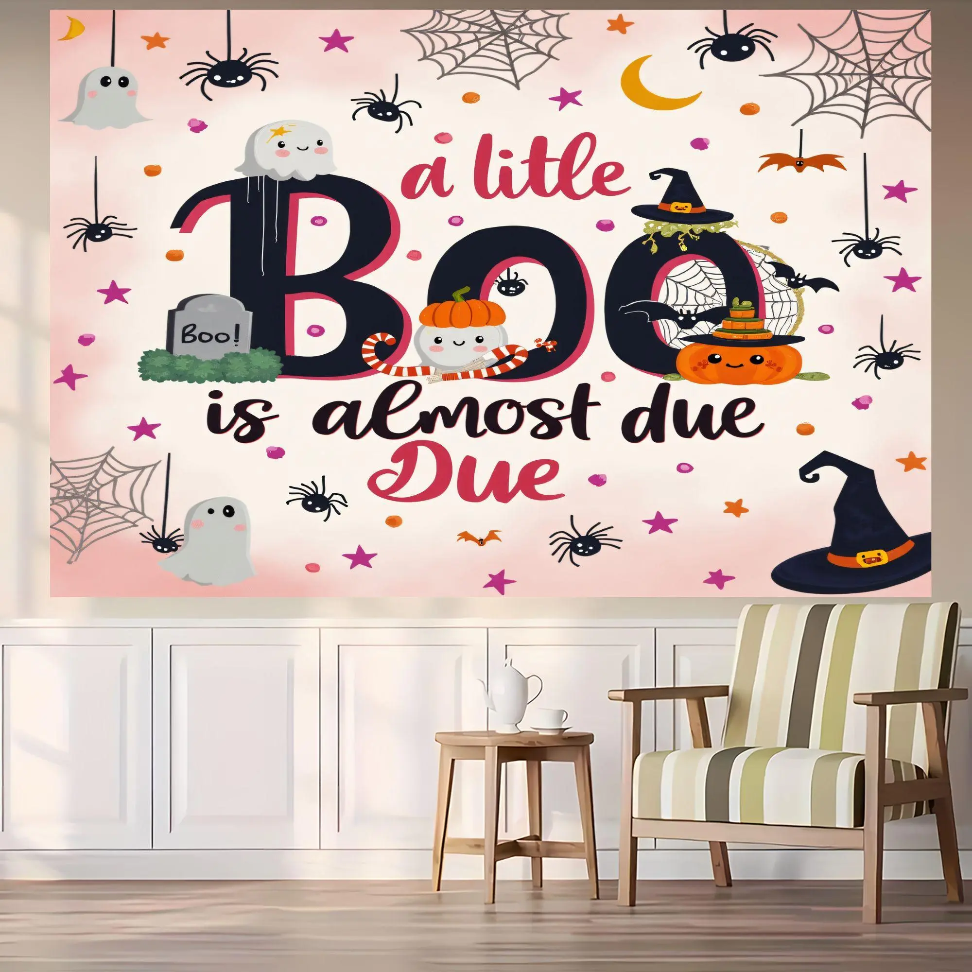 2D Flat, "A Little Boo" -Friendly Halloween Tapestry Wall Hanging - Cute Ghosts, Bats, Witches & Pumpkins with Pink Polka Dots & "Boo" Lettering - Easy Peel & Stick Installation Kit (No Tools), Party, Bedroom Decor - Soft, Tapestries, Halloween Pillow
